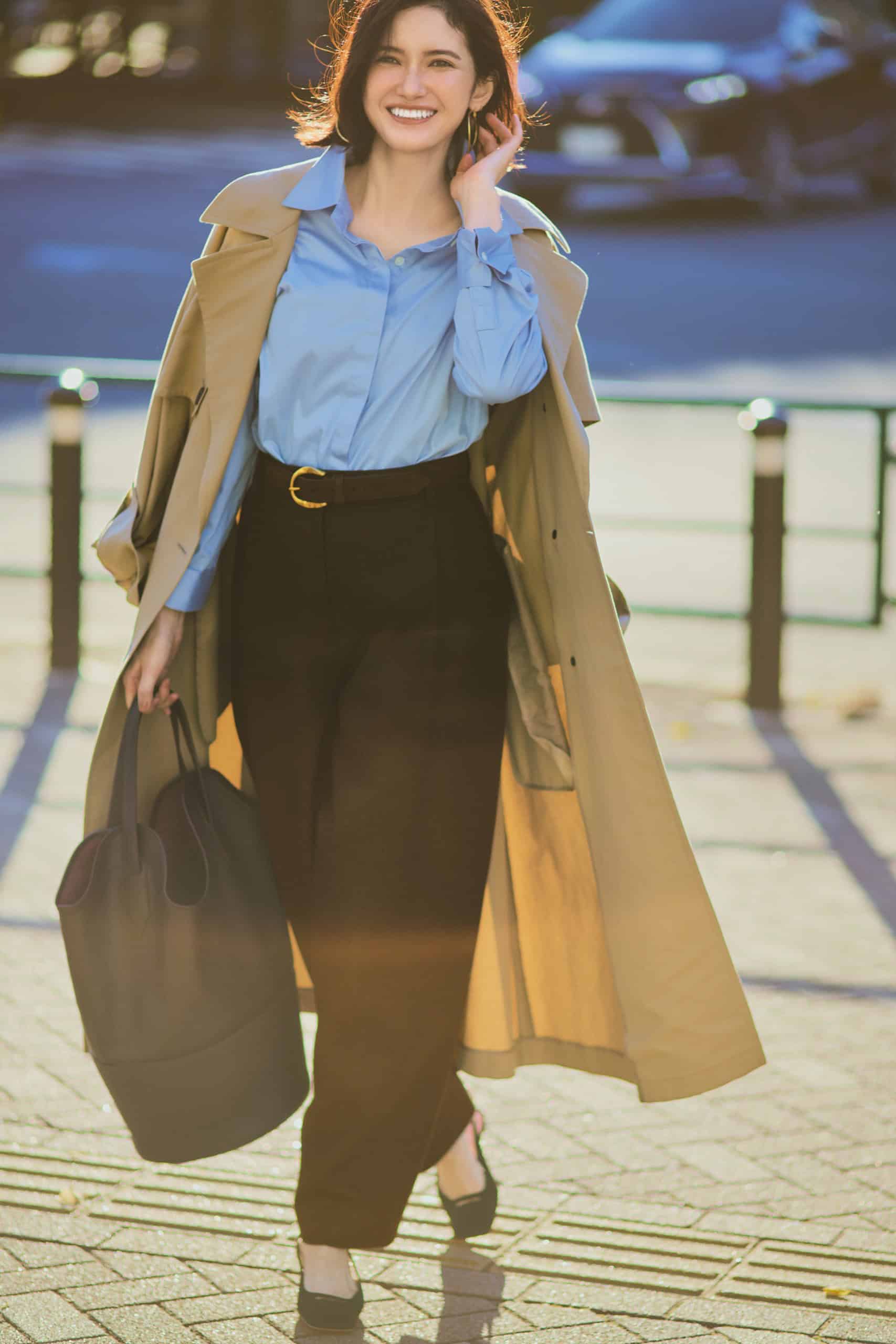 パンツ¥40,700シャツ¥20,900(ともにブロッサム)トレンチコート¥165,000(コラム/エストネーション)バッグ¥209,000ベルト¥42,900(ともにJ&M デヴィッドソン/J&Mデヴィッドソン カスタマーセンター)パンプス¥69,300(ペリーコ/アマン)ピアス¥17,600(アビステ)