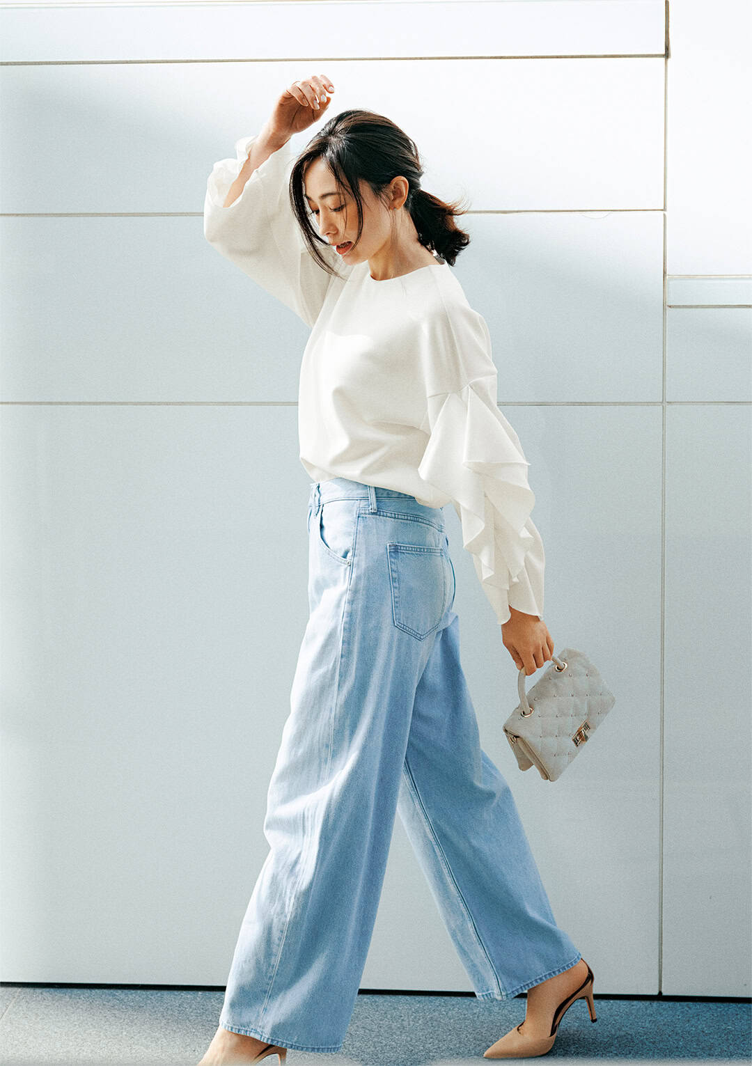 パフスリーブトップスはワイドデニムで程よくカジュアルダウンするのが今どき。甘さを抑えながら華やいで、ライトブルーデニムが軽やかで春らしい印象に仕上げます。