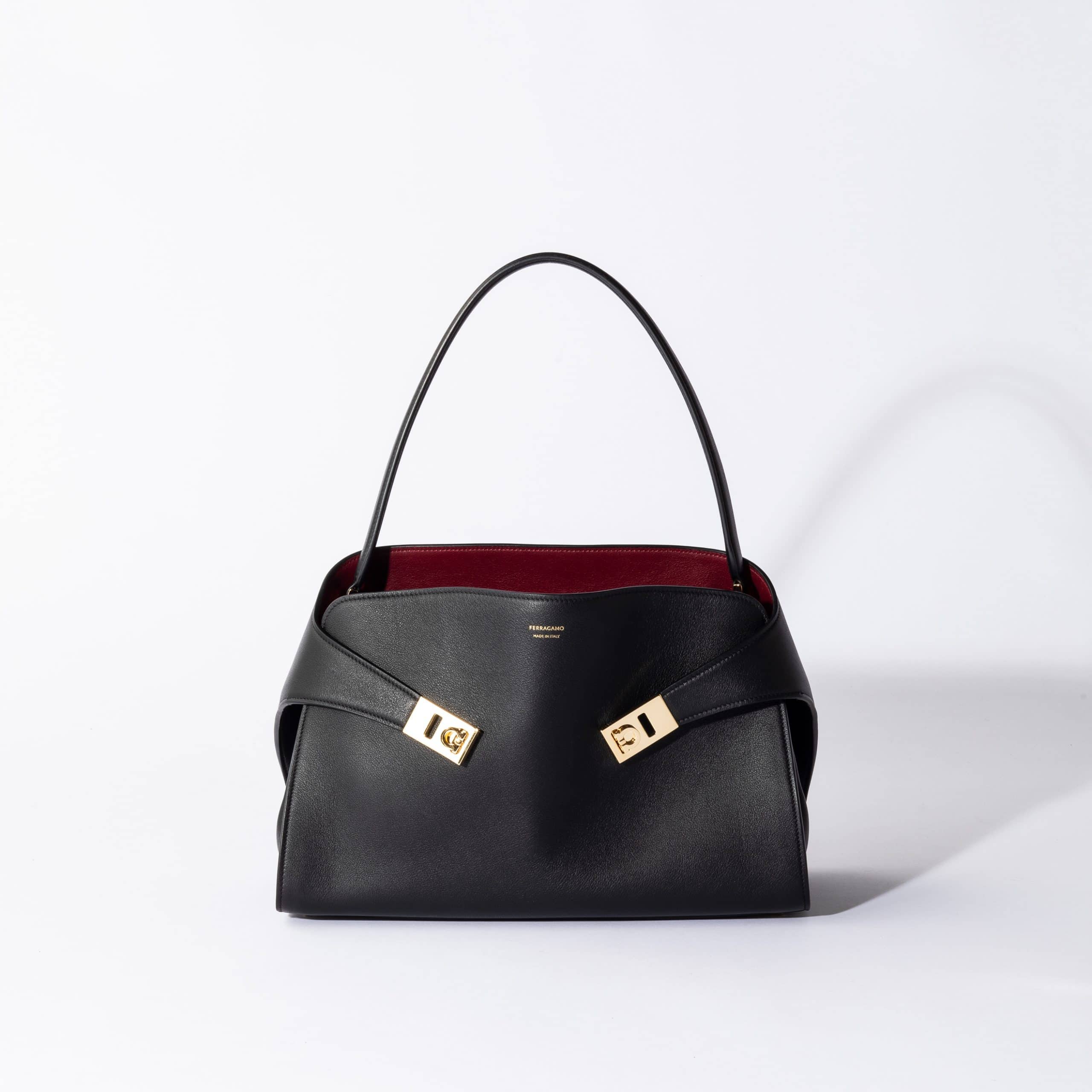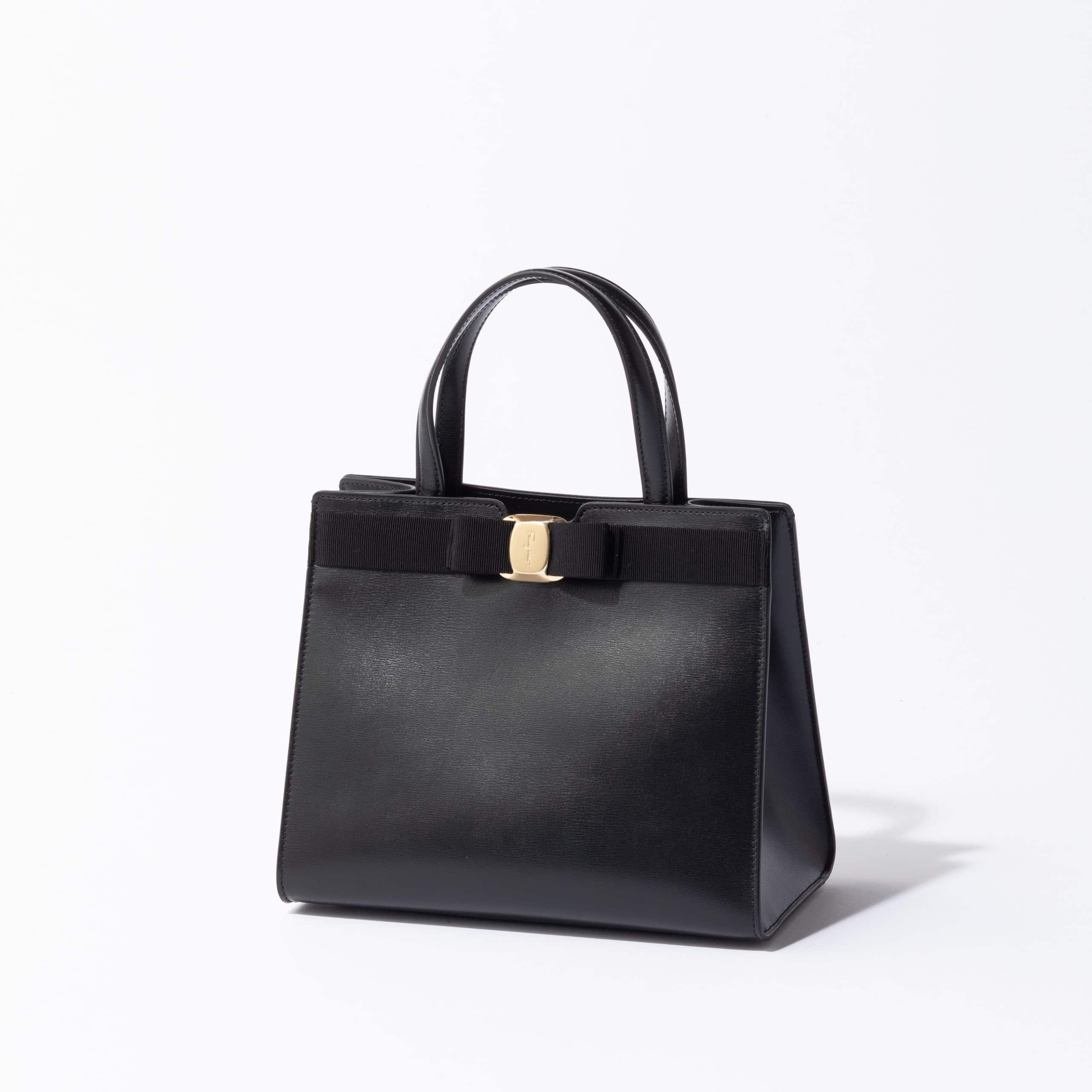 フェラガモの象徴、ヴァラリボンを配したトップハンドルバッグ。洗練されたブラックがフォーマルシーンでの装いを格上げします。控えめな光沢が女性らしい優雅さを引き立て、エレガンスの真髄を体現する逸品。特別な日の装いに寄り添う、気品漂うバッグです。