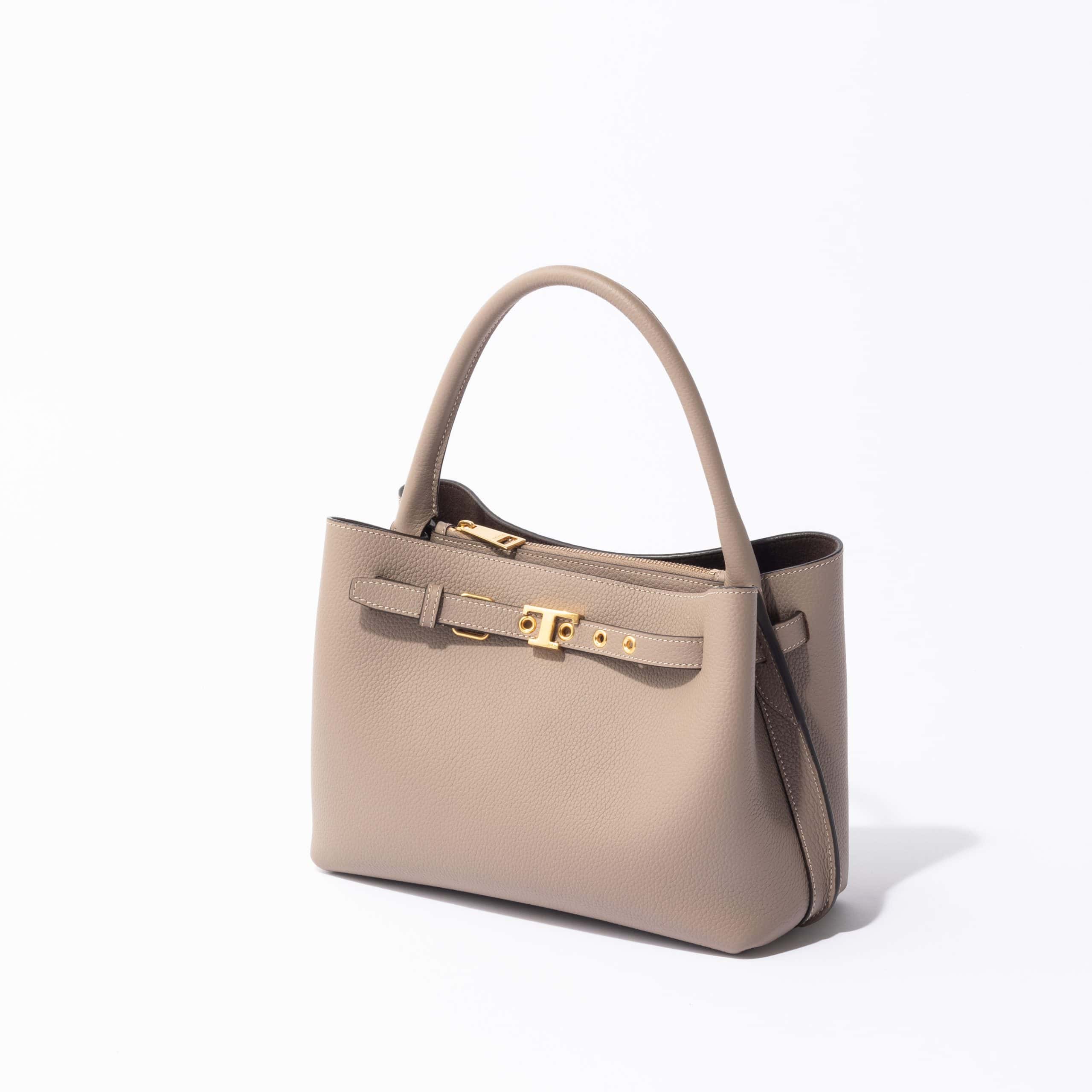 柔らかなベージュが手元を上品に演出するトッズの新作。コンパクトながら荷物はしっかり収まり、フォーマルシーンにも最適です。シンプルなフォルムと上質なカーフレザーに、トップエッジにあしらったTタイムレスのメタルアクセサリーが洗練されたアクセントを添えます。