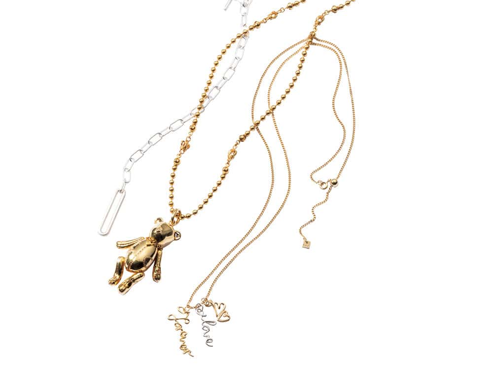【下】トップ〈Forever〉¥20,900〈Love〉¥18,700〈ハート〉¥19,800〈チェーン〉¥26,400(すべてバー ジュエリー/エルディスト ショールーム)【中】トップ¥104,500チェーン¥68,200(ジャスティン デイビス/ジャック・オブ・オール・トレーズ プレスルーム)【上】ペンダント(上モデル着用分)