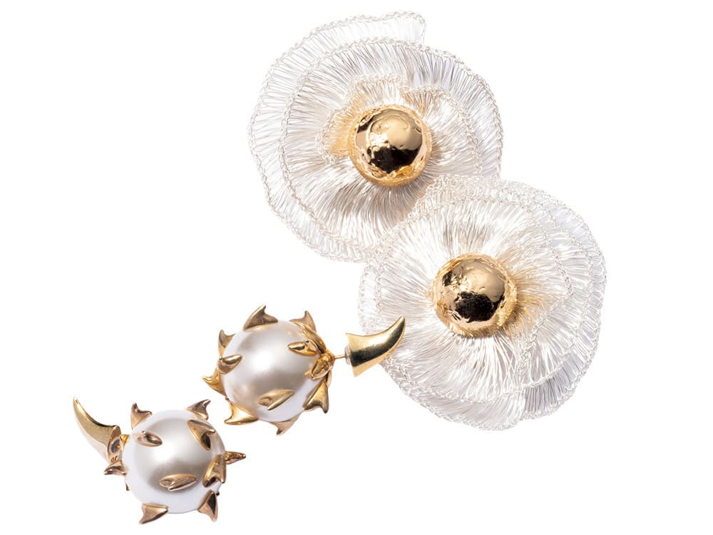【右上】フラワーイヤリング¥19,800(アビステ)【左下】パールピアス各¥42,900(ジャスティン デイビス/ジャック・オブ・オール・トレーズ プレスルーム)