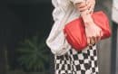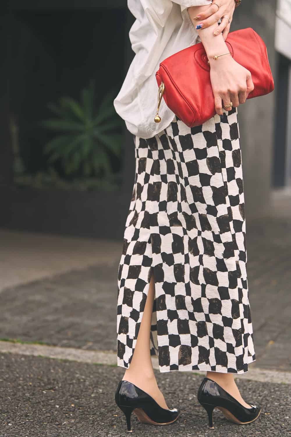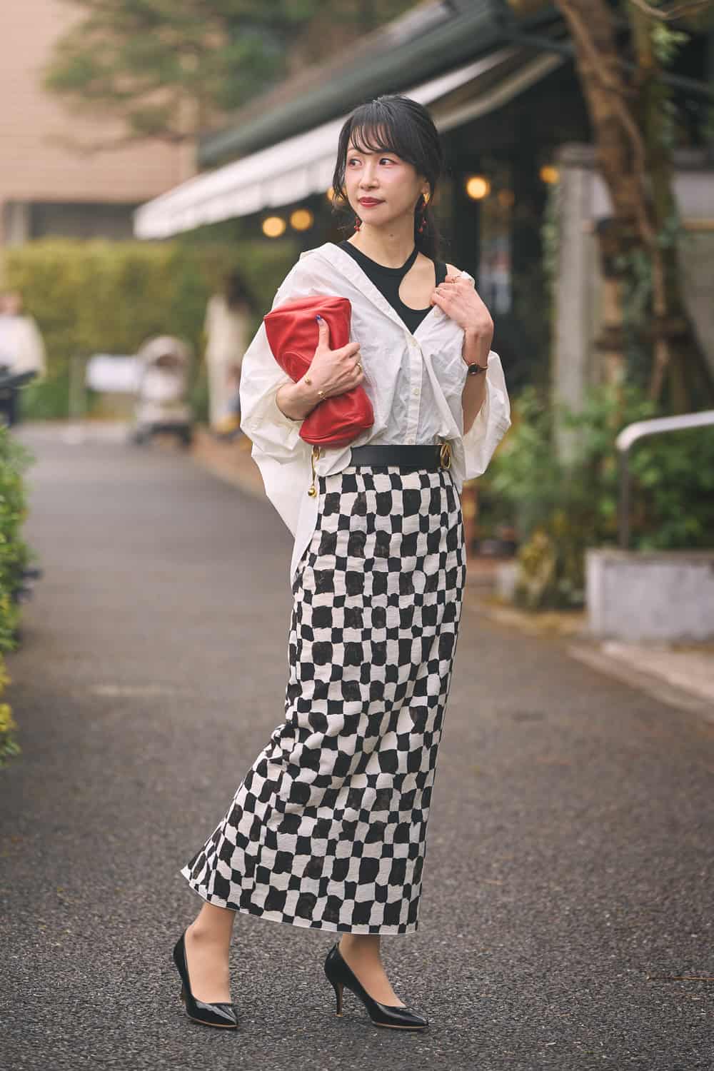 「一見シンプルながら、よく見ると不均一な柄が個性的な幾何学柄スカートが主役。薄手の素材でも下半身のラインを拾いにくく、すっきりと細見えを叶えてくれる優秀な一枚です。装いはモノトーンでまとめ、ピアスとバッグの赤をアクセントにして洗練度をアップ。胸元にデザインインナーを忍ばせ、スカートの柄だけが浮かないバランスを意識しました」