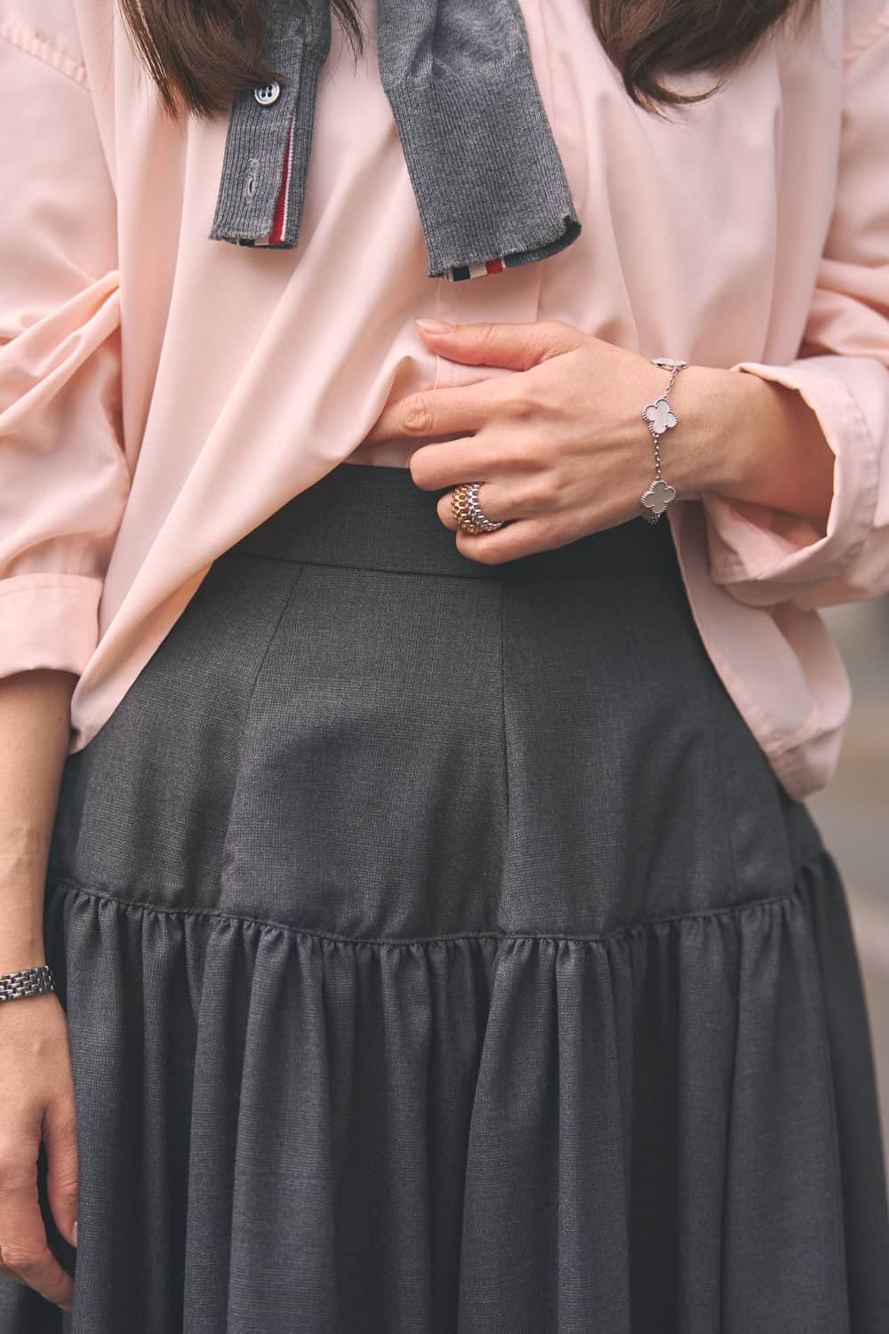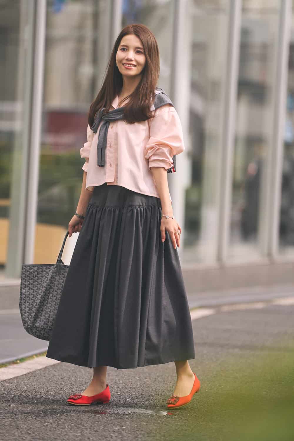 「cccmalieは毎シーズン素敵なアイテムが揃うので欠かさずチェックしているブランド。今回着用したたっぷりギャザーのスカートは、途中に切り替えが入ったデザインでお腹周りから広がらず、裾がストンと落ちる大人っぽいシルエットがお気に入りです。甘くなりすぎないグレンチェック柄もポイント。淡いピンクの短丈シャツと赤いパンプスを合わせて、春らしい軽やかな装いにまとめました」
