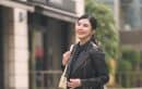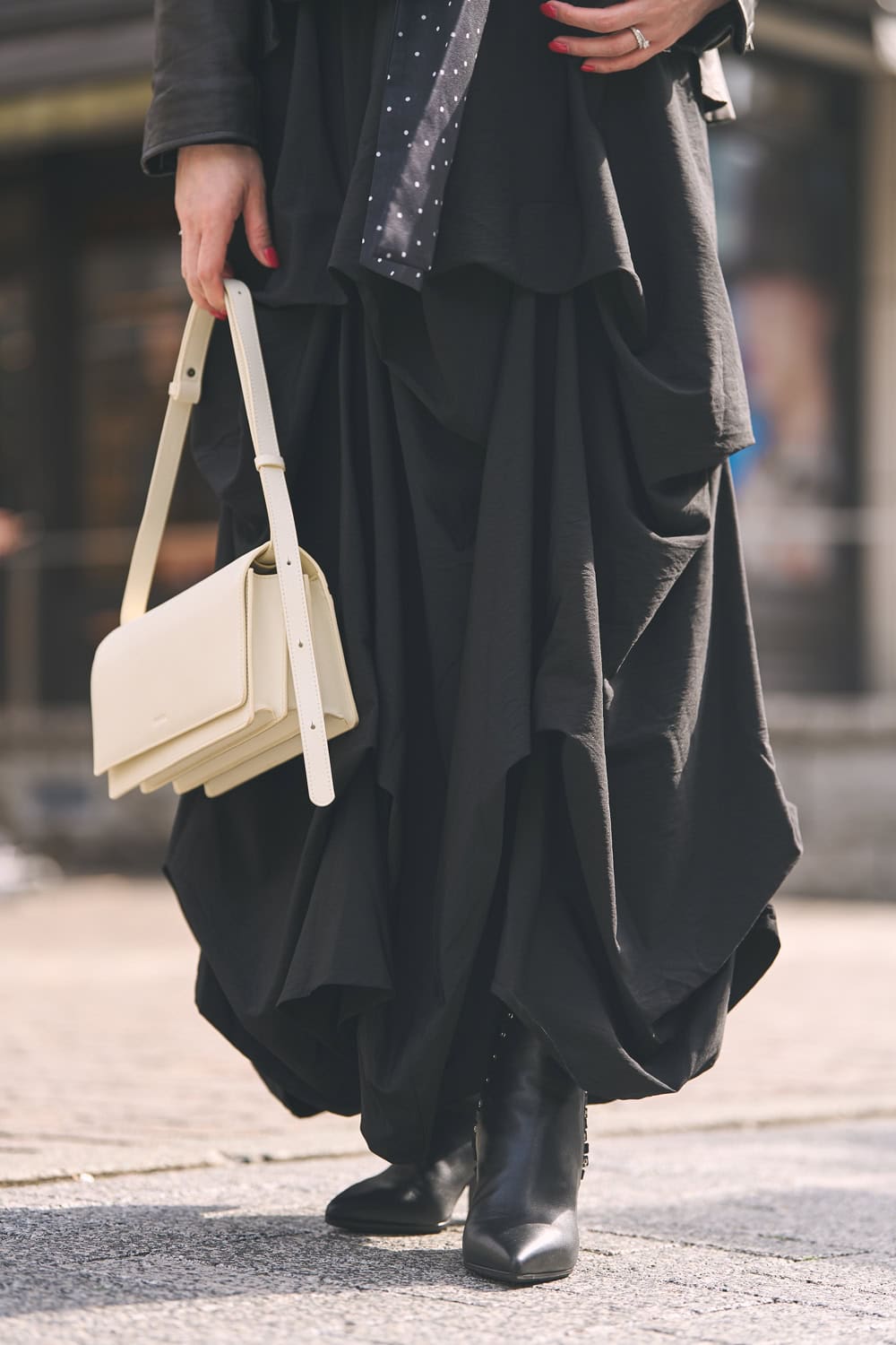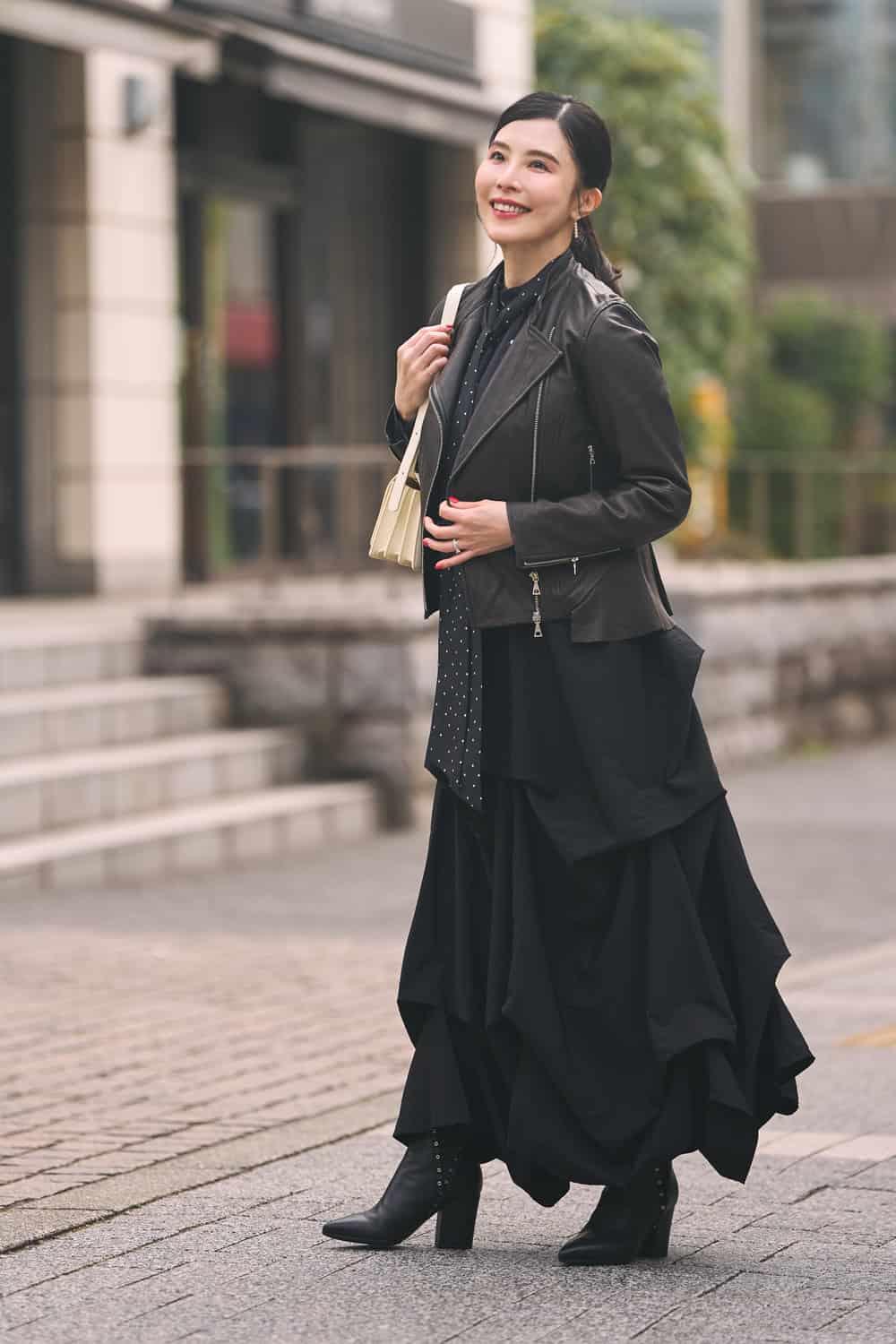 「デザイン性のあるスカートが好きでよくはきますが、こちらはアシンメトリーに入ったドレープが印象的な一枚。ブラックでも立体感があり、華やかな雰囲気に見せてくれます。甘くなりすぎないようレザージャケットを合わせ、インナーはドット柄ブラウスでさりげなくアクセントを。バッグはホワイトを選び、全体に軽さをプラスしました」