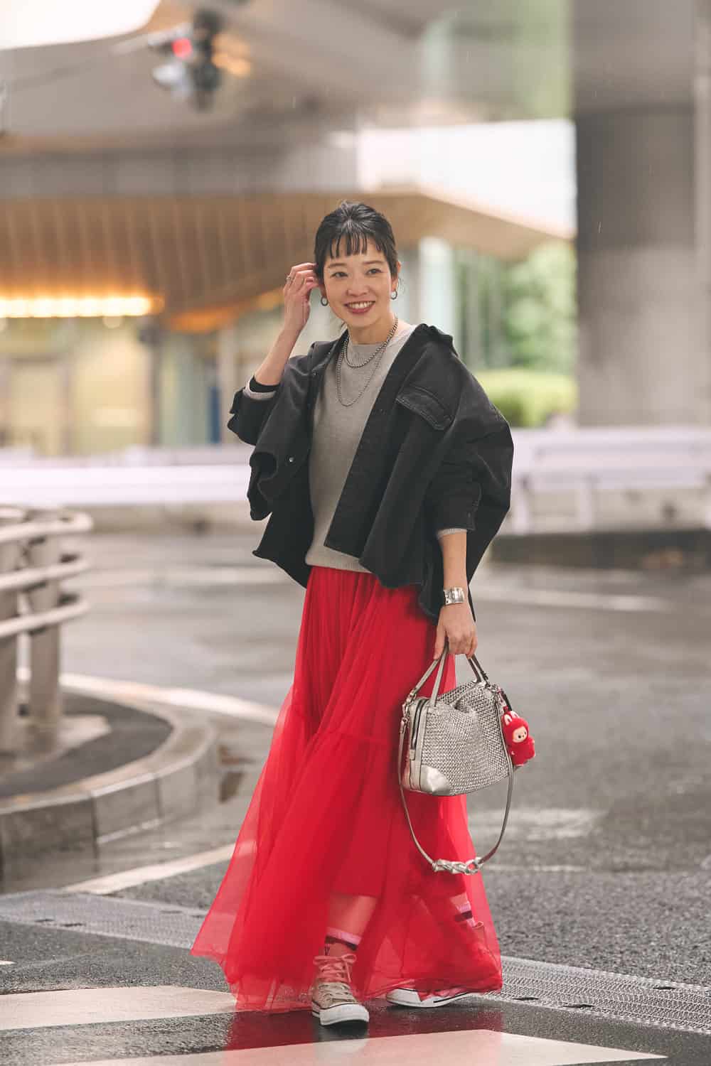 「真っ赤なチュールスカートは、それだけで主役級の存在感。ウィンドショッピング中に目に入り、一目惚れして衝動買いしました。甘くなりすぎないよう、足元はあえてコンバースを合わせてカジュアルダウン。きれいめにまとめるより、少しラフに着崩すバランスが自分らしいと思っています」