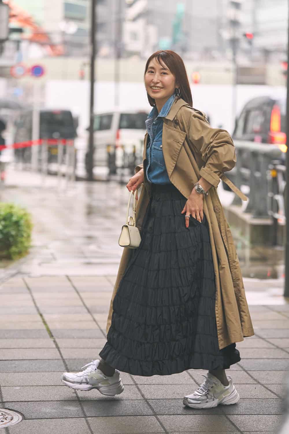 「何段にも重なったティアードに細かいギャザーが入り、立体的に広がるデザインが魅力のスカート。ブラックでもしっかり存在感があり、コーデの主役になる一枚です。きれいめに合わせるのも素敵ですが、今回はごつめのスニーカーとデニムシャツを合わせてカジュアルな雰囲気に。合わせ方次第で違った表情が楽しめるところもお気に入りです」
