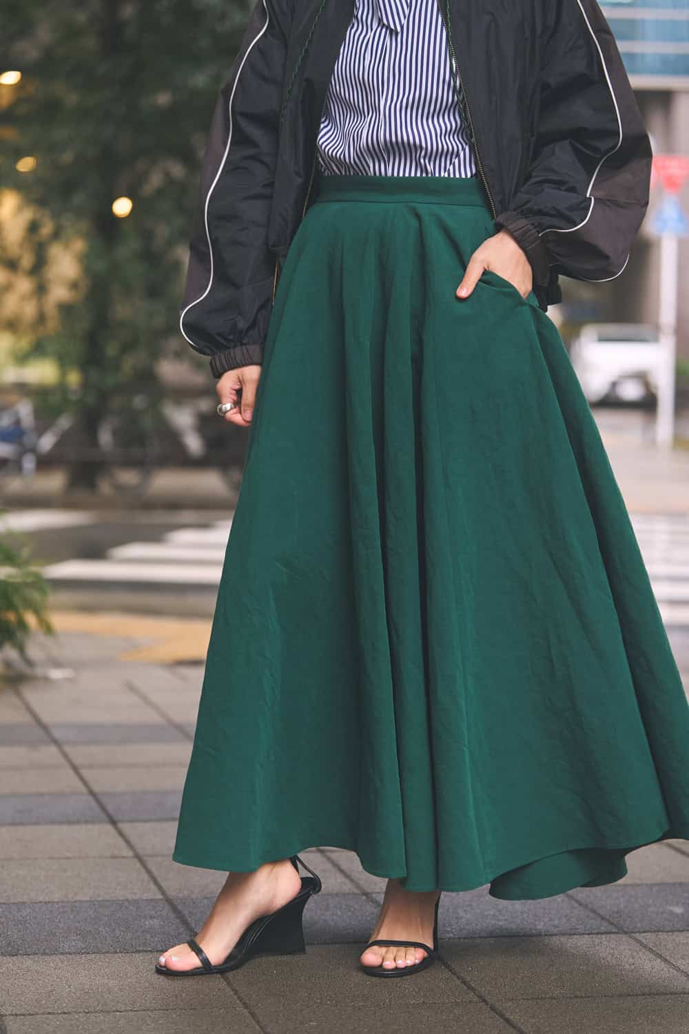 「たっぷりとしたフレアで存在感のあるスカートですが、リネンの風合いと落ち着いたグリーンカラーで甘さ控えめに着られる一枚。スポーティーなブルゾンにトラッドなストライプシャツを合わせて、大人のスポーティーMIXに仕上げました。足元は華奢サンダル、バッグはチェーンのミニバッグを選び、女性らしさをさりげなくプラス」