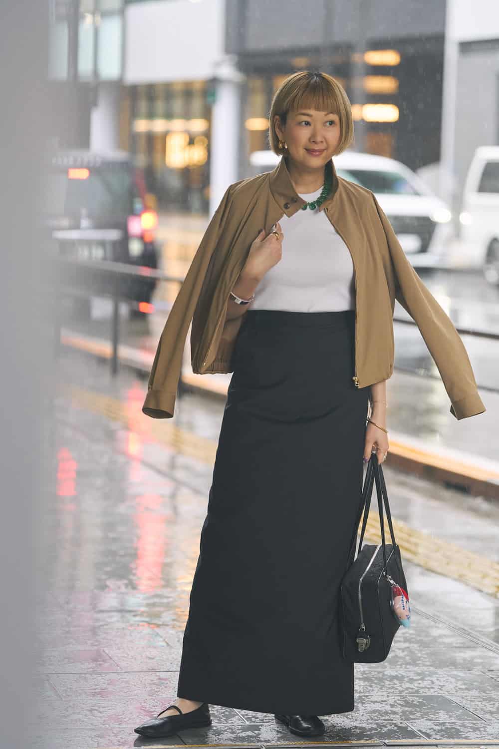 「25年秋冬のオブリオのスーパーマキシタイトスカートは、履くだけで女らしいスタイルが完成するお気に入り。深めのスリットと長めの丈感に一目惚れして展示会でオーダーしました。スリットが深いので、足さばきもよく、見た目以上に軽やか。セットアップで購入しましたが、今回はブルゾンを合わせてカジュアルに着崩し、ベージュ×ネイビーで品よくまとめました」
