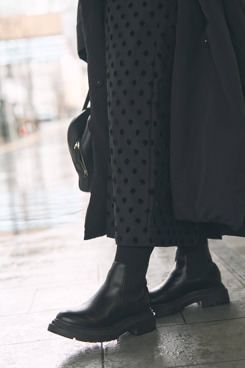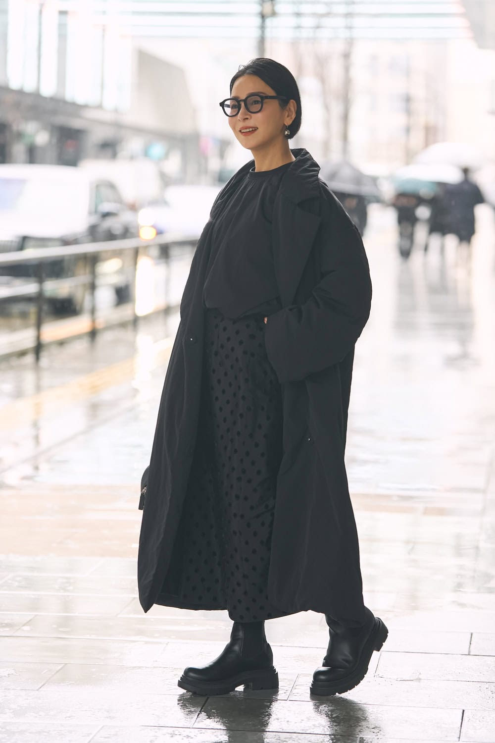 「Iラインのドットスカートは、柄だと少し甘くみえがちなのでオールブラックでまとめて大人っぽく。ブラックベースに地柄ドットなので主張しすぎず、さりげない柄感もお気に入りです。トップスはシャリ感のある素材を合わせて、質感の違いで奥行きをプラス。最近購入したBLUEEL EPHANTのサングラスで、モードな雰囲気に仕上げました」
