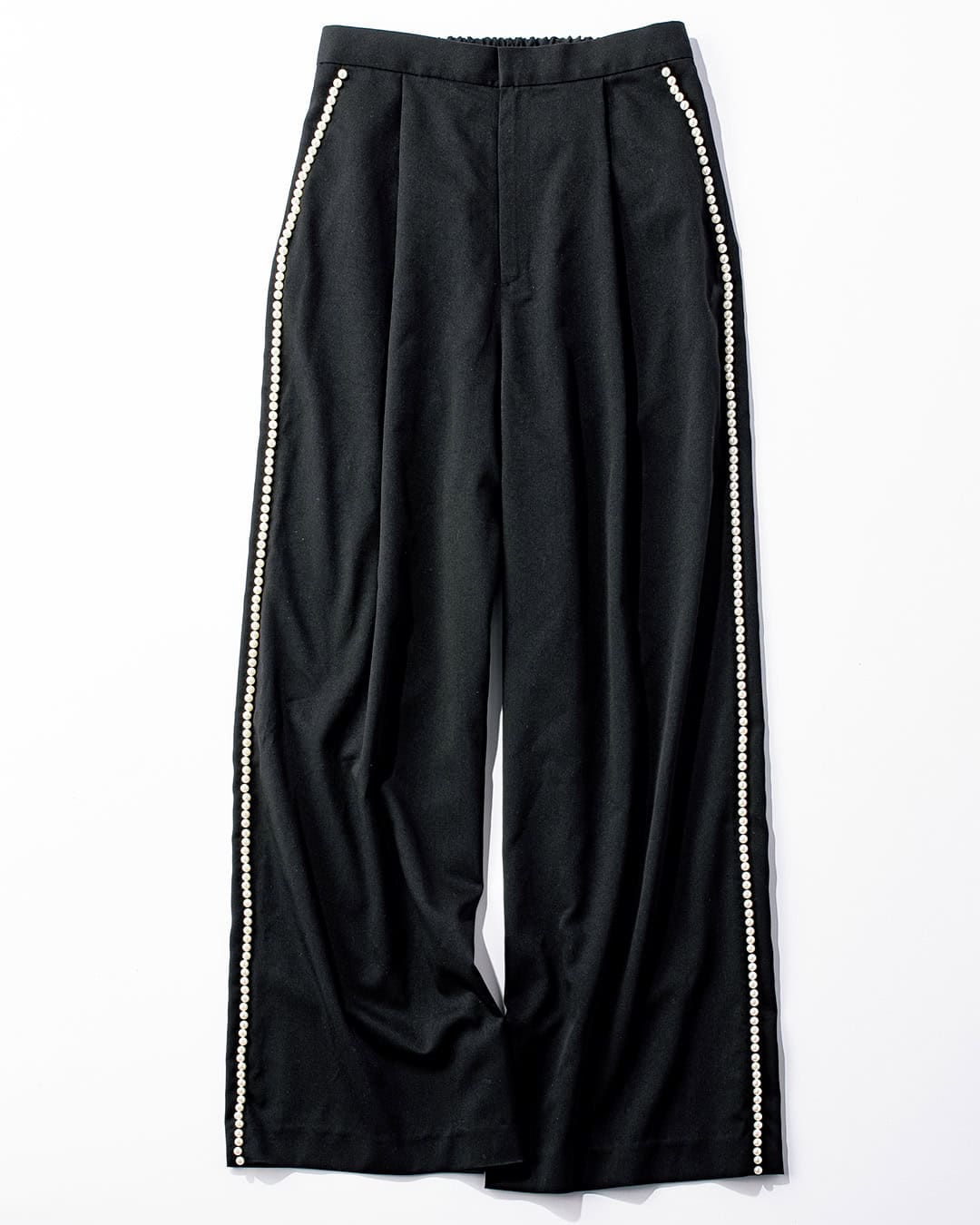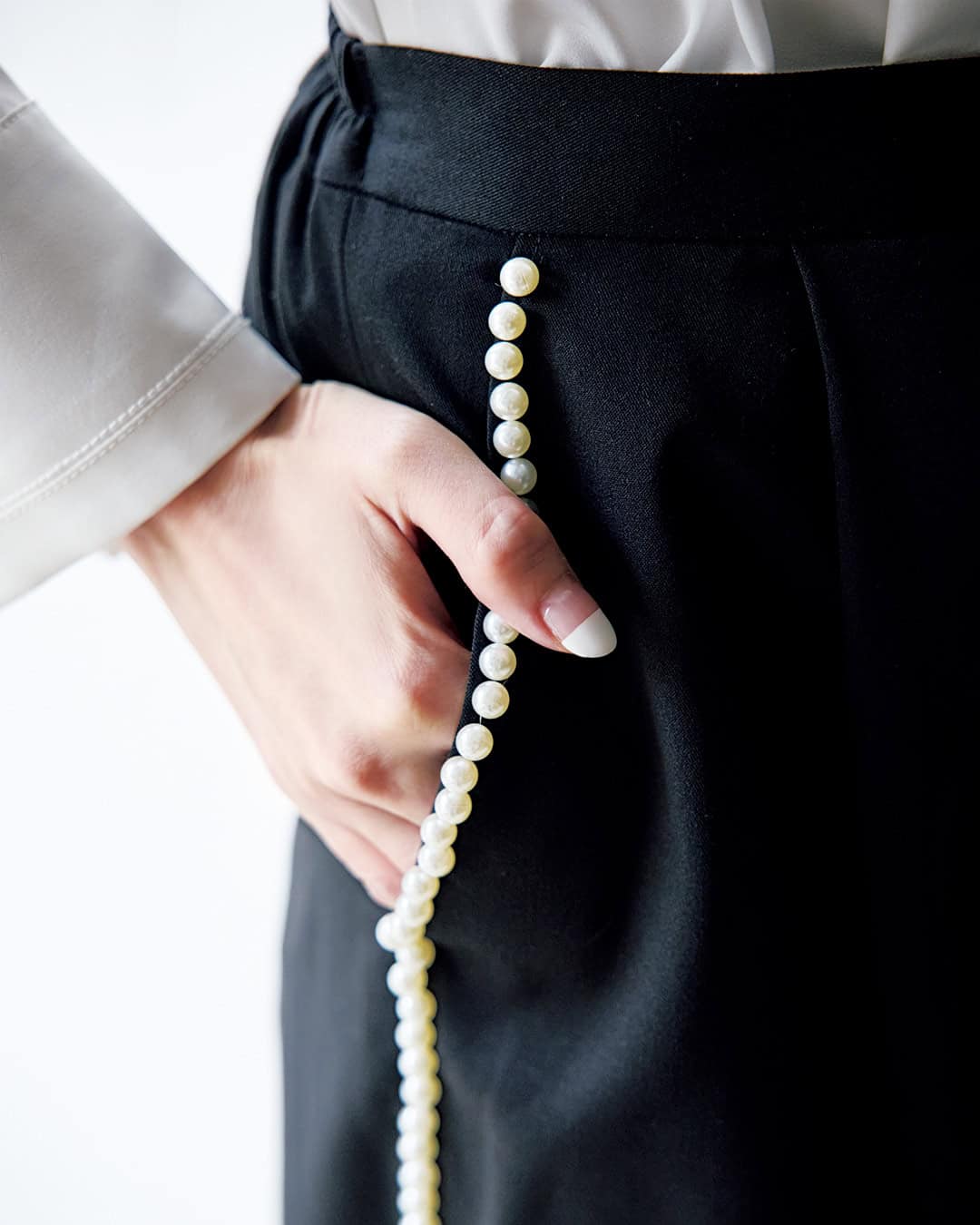 人気のラインパンツのラインをパールに変えました。これならカジュアルになりすぎず、品のいい甘さを纏えます。しかもパールのラインが縦のラインを強調するので脚長効果は絶大です。ウエスト部分はゴムを使用しているので穿いていてストレスがありません。ブラックとよりカジュアルな印象のベージュの2色展開。もちろん家庭での手洗いが可能です。
