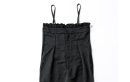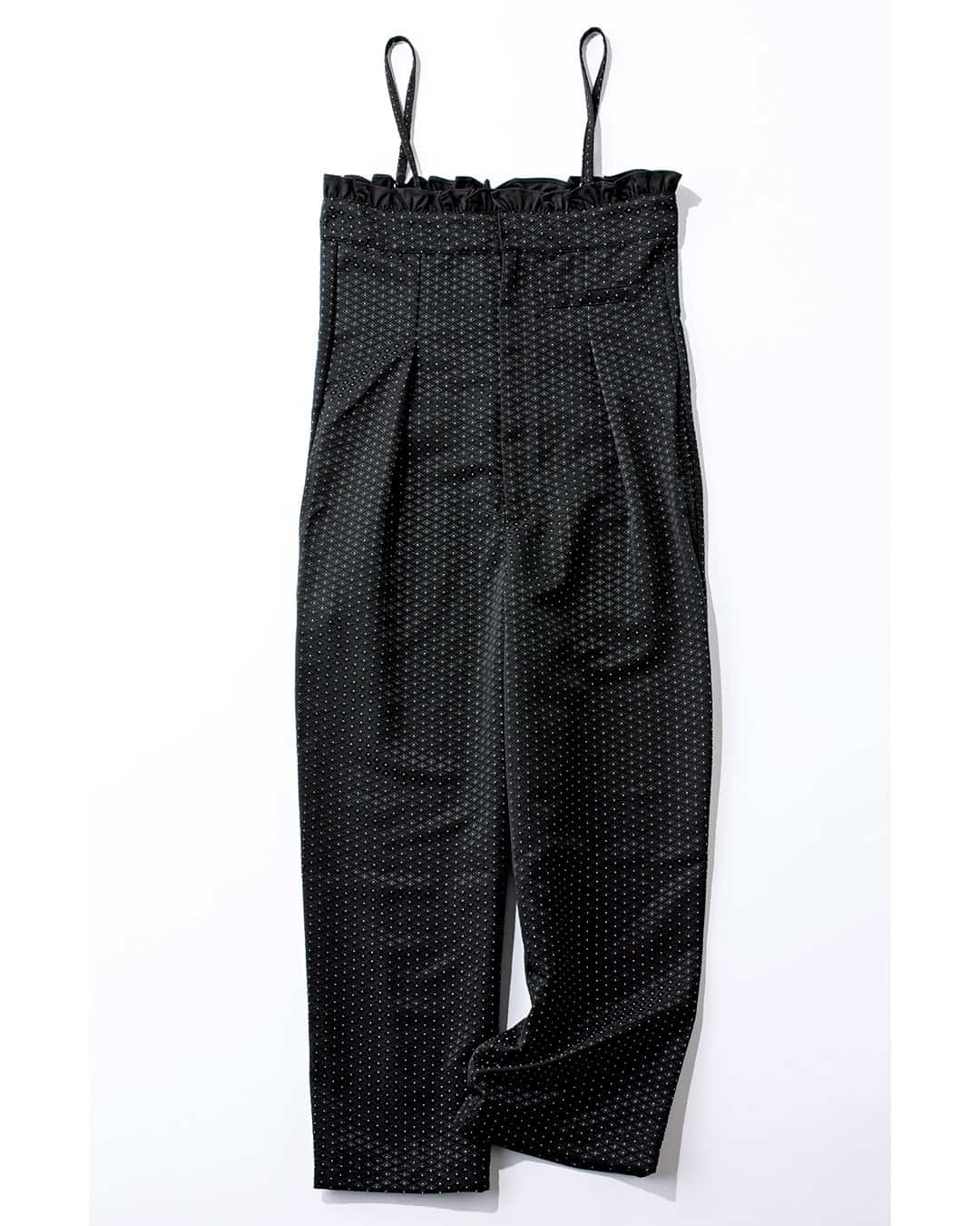 胸元のさりげないフリルが顔まわりを華やかに見せてくれ、ヒップにあるフリルポケットでお尻周りをカバー。細めの肩紐で女性らしい華奢な印象に。ゆとりのあるワイドシルエットながら、フロントタックがすっきりとしたラインを演出します。インナー次第でカジュアルにもきれいめにも着まわせる、シーズンレスな1枚。シアートップスやブラウス、ニットなどを合わせたレイヤードスタイルがオススメ。カジュアルにスニーカー合わせはもちろん、ヒールやブーツなどと合わせてきれいめにも着ていただける万能アイテムです。