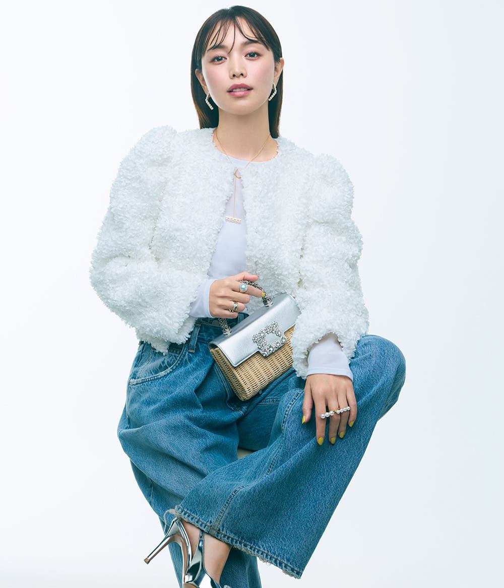 ジャケット¥42,900カットソー¥17,600(ともにHER.)デニムパンツ¥59,290(エー・ゴールド・イー/シチズンズ・オブ・ヒューマニティ)バッグ¥743,600(ロジェ ヴィヴィエ/ロジェ・ヴィヴィエ・ジャパン)パンプス¥192,500(ジャンヴィト ロッシ/ジャンヴィト ロッシ ジャパン)ピアス¥869,000ペンダント¥623,700リング[左手]¥666,600[右手]人指し指¥1,012,000[右手]薬指YG¥464,200[右手]薬指パール付¥594,000(すべてTASAKI)