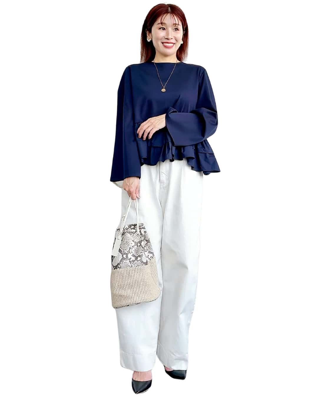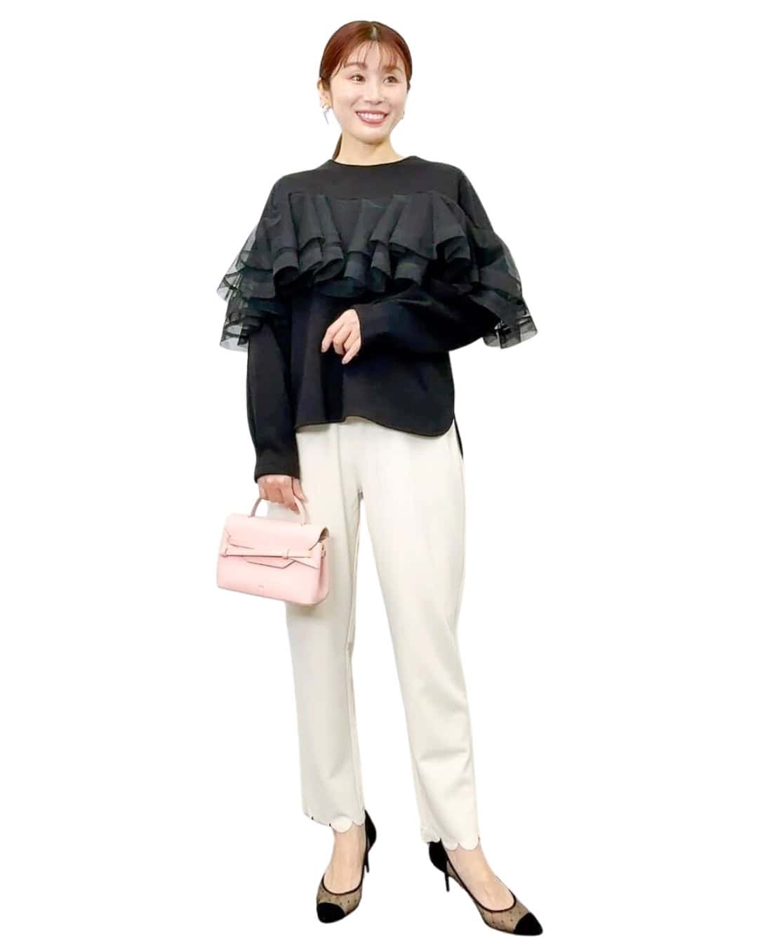 ★ ④シンプルだから品よく華やぐ「フリルトップスコーデ」