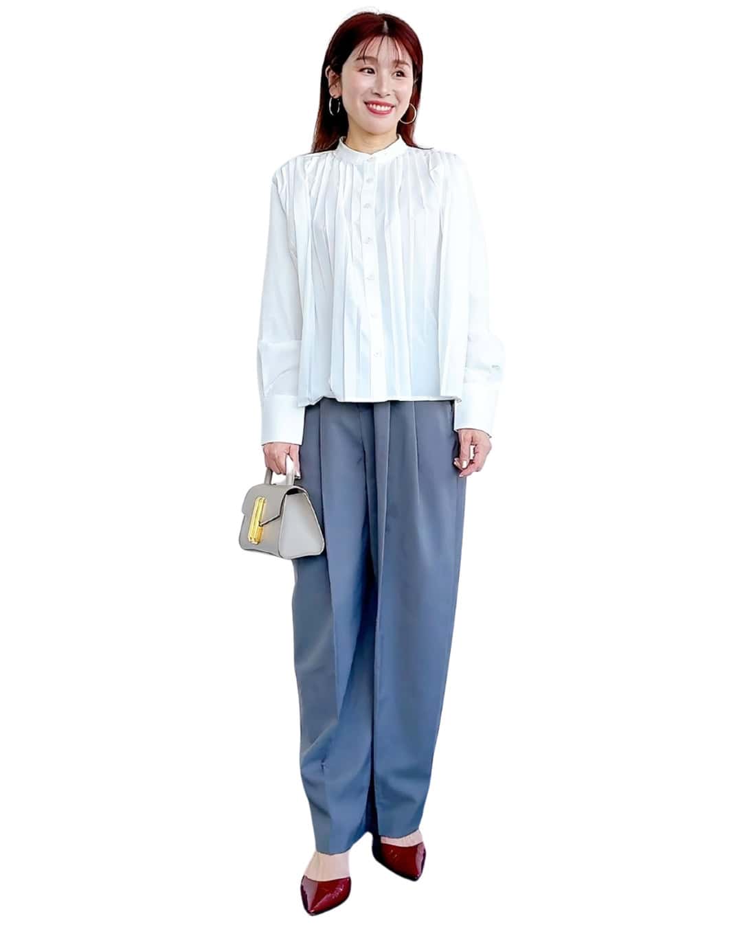 ③学校行事やきれいめシーンにも安心な「プリーツブラウスコーデ」