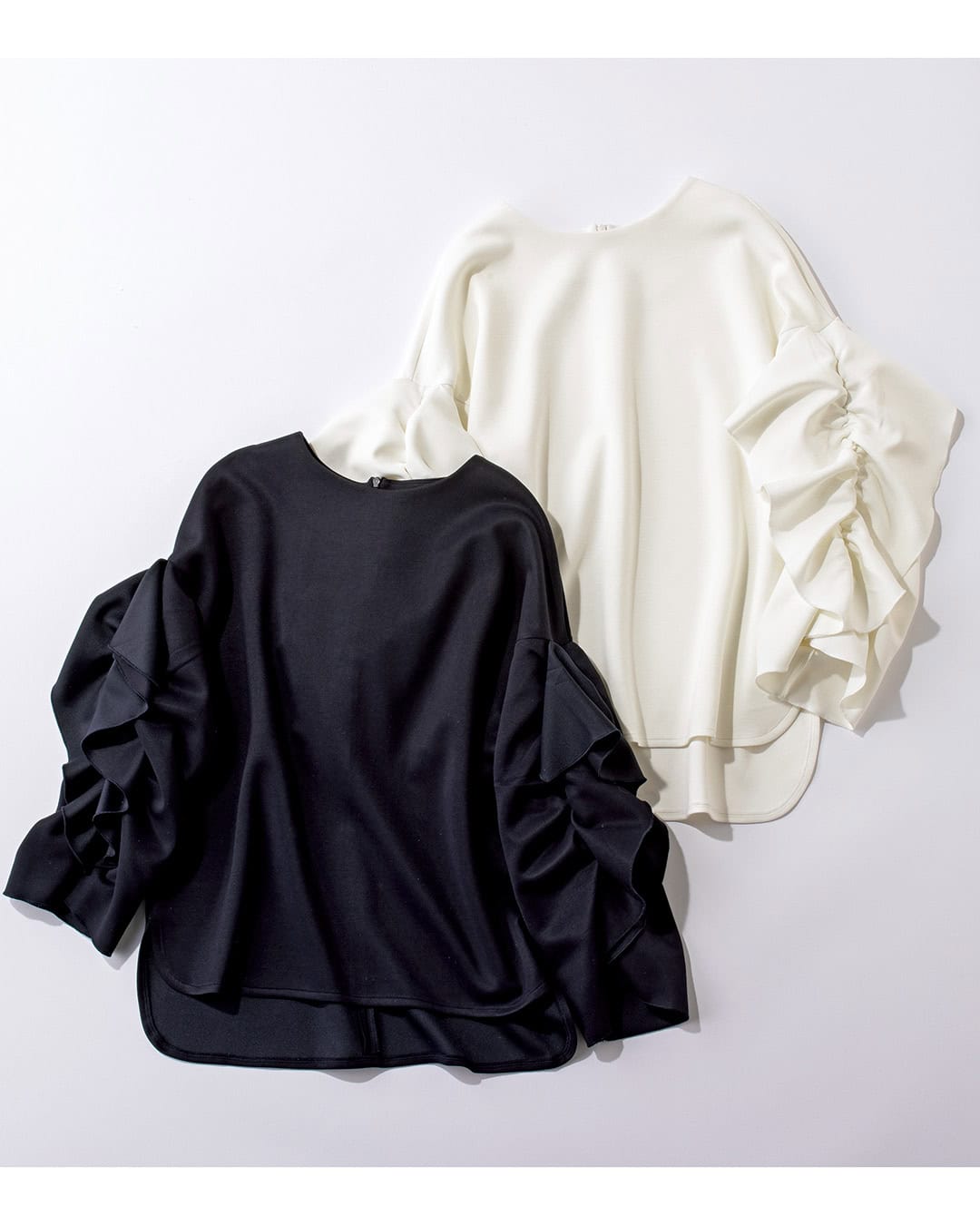 季節を選ばない、着回し力も高い即モト取れな映えトップス!肌あたりの柔らかい薄手のポンチ素材を使用。お尻をカバーできるバックロングとサイドスリットで、裾をインしてもアウトしても着こなしがキレイに決まります。自宅でのお洗濯可。スウェット素材でも袖の立体フリルのお陰でエレガントな表情なので、ブラウス感覚で着られるカットソープルオーバーです。ストレッチ性があり着心地が良く、家庭洗濯OKなのも嬉しい。きれいめにも着られる上品な濃いネイビーと白のカラーバリエーション。