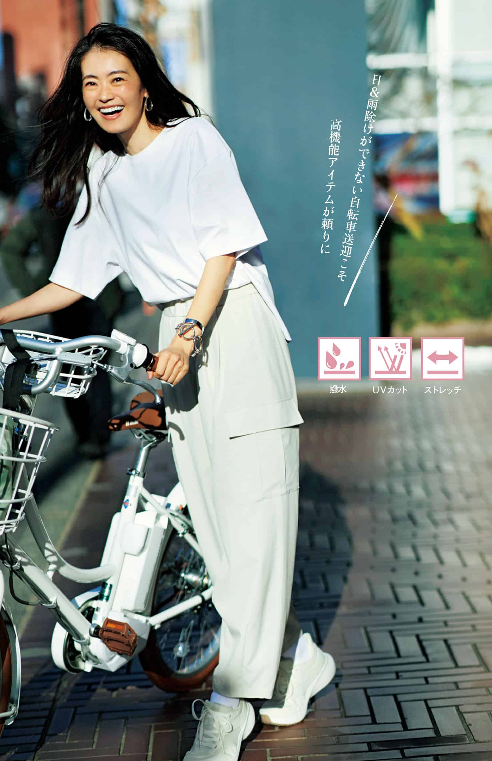 生活感を払拭する爽やかな白×やさしげな淡色コーデ。ワンツーでもサマになるこなれ感のあるカーゴシルエット。急な小雨もスマートにダッシュ→帰宅後すぐ洗えるのも嬉しい。