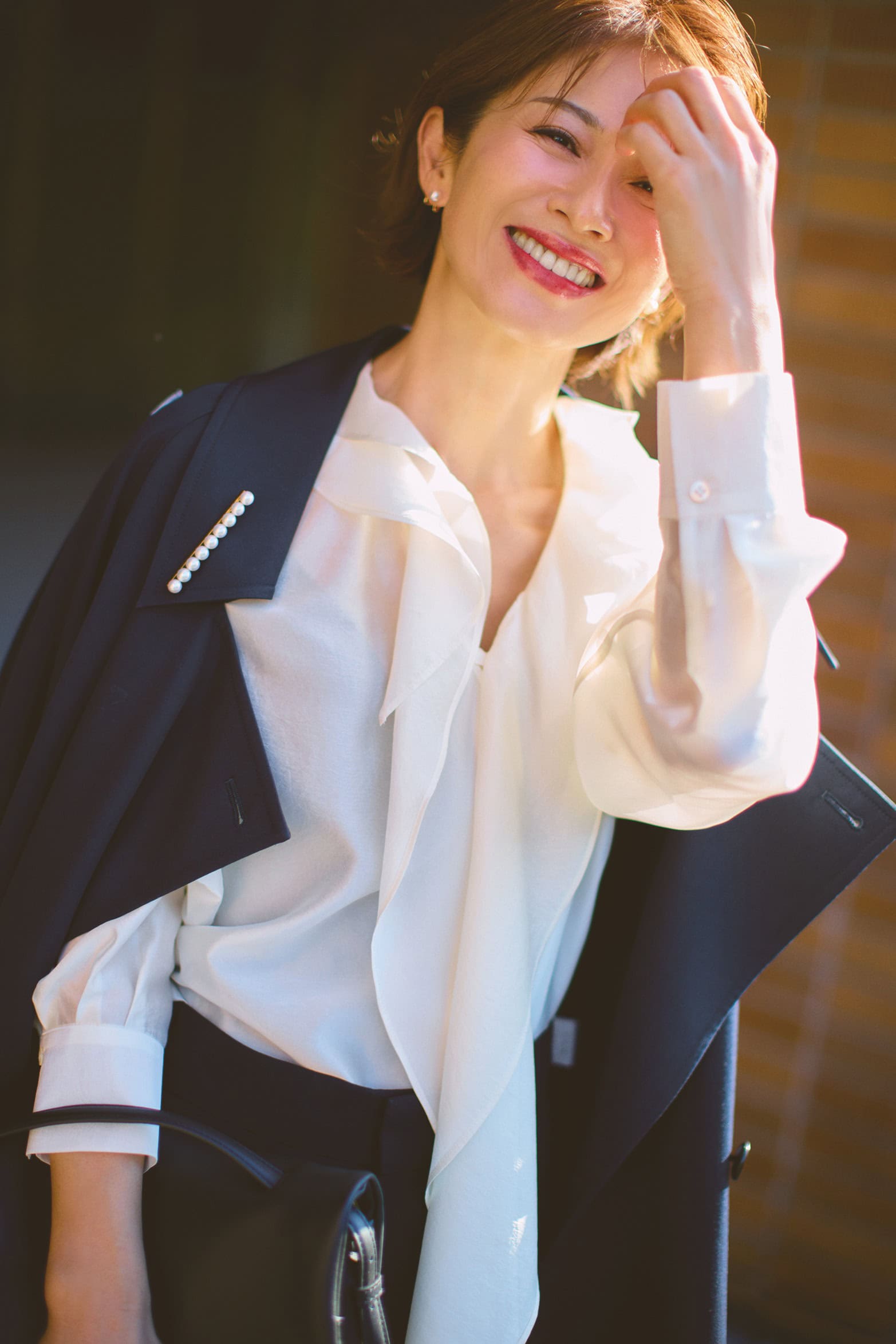 ボウタイブラウス¥63,800(ハルノブムラタ/ザ・ウォール ショールーム)ジャケット¥121,000 (マディソンブルー)パンツ¥25,300(ルーニィ)バッグ¥253,000 (ボナベンチュラ)ピアス¥272,800リング¥880,000(ともにTASAKI)