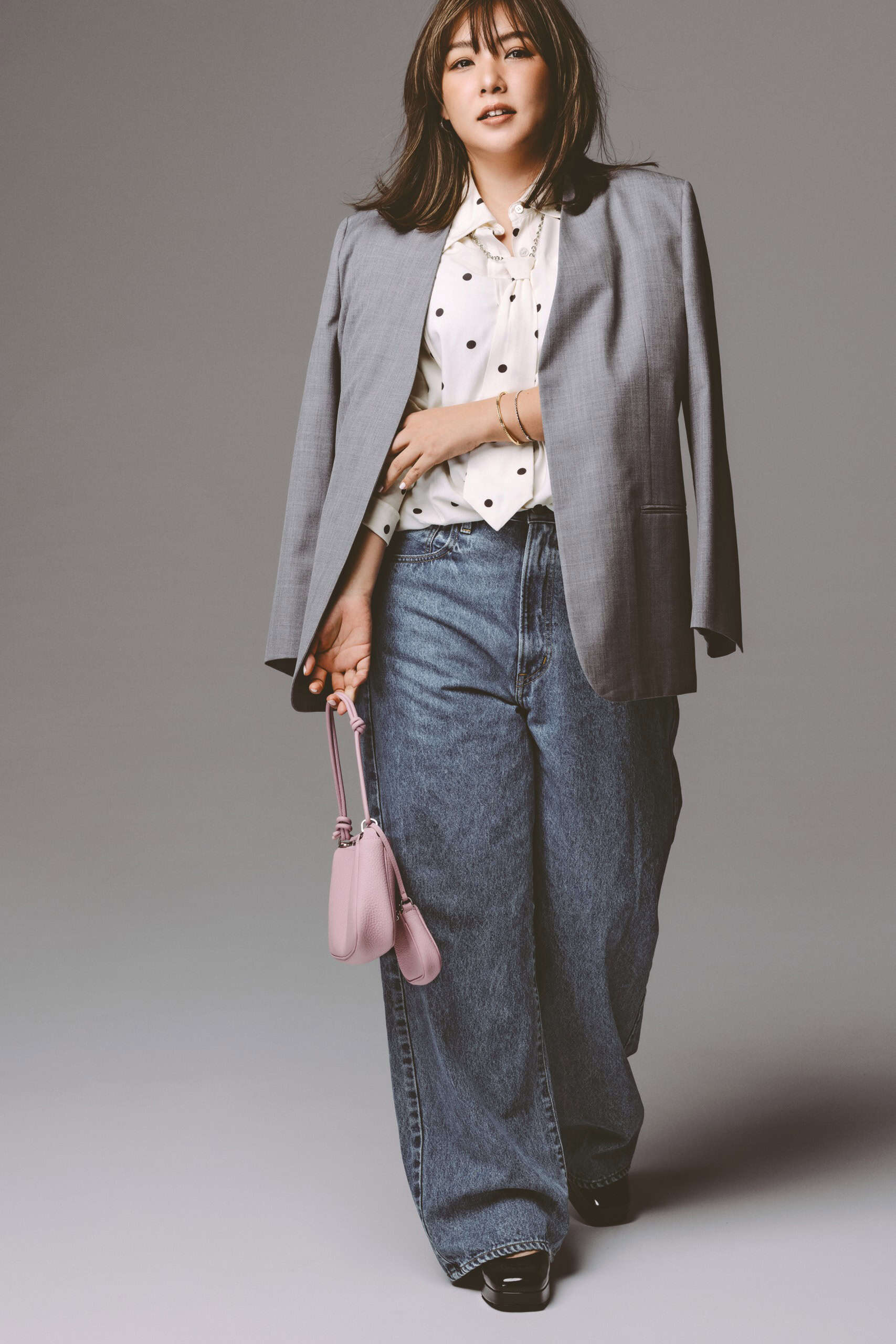 ヒップや太ももを自然にカバーしながらルーズなデニムには、ドットブラウスが華やぎを添えて程よく女性らしい印象へ。ジャケットを重ねて、カジュアルを大人っぽく引き締め。
