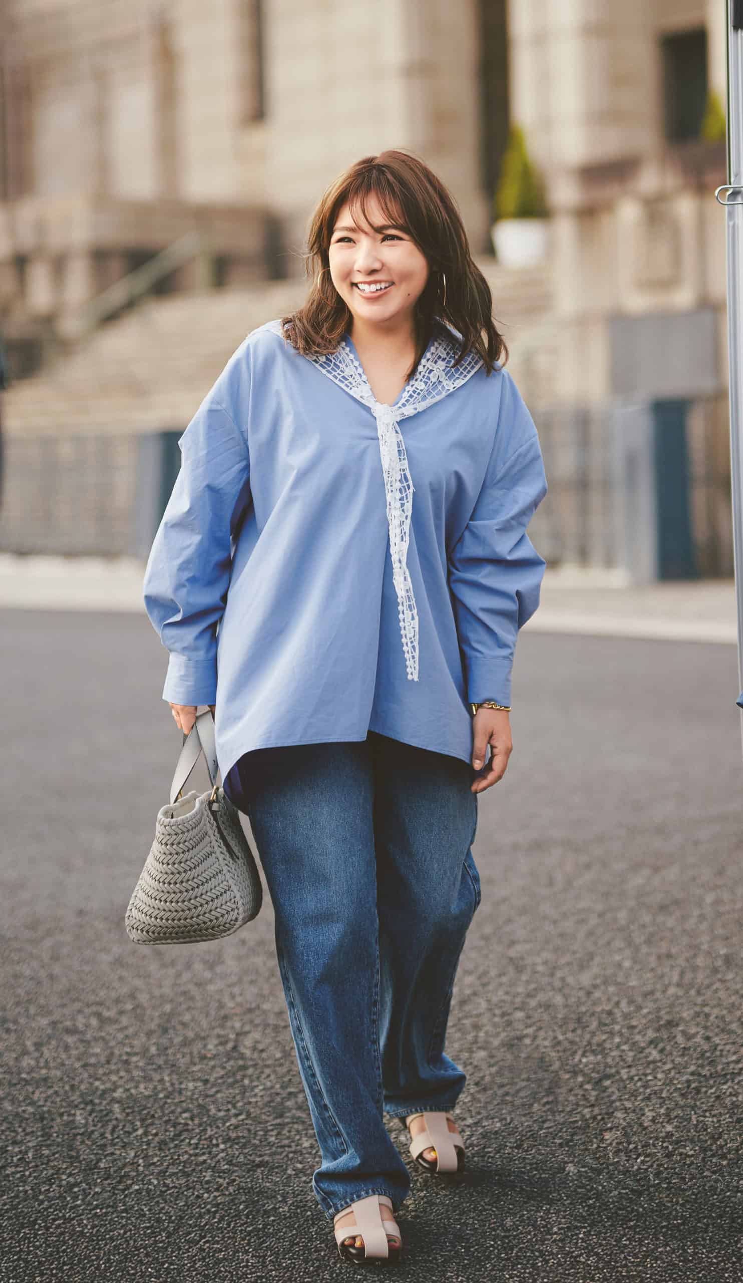 シャツとデニムをブルーのワントーンでまとめ、春らしく爽やかな印象に。ざっくりとしたサイズ感のシャツには、あえて広がりすぎないのワイドパンツを選ぶことで、メリハリが効いてキレイ見えするバランスに。首元にレースのアクセントがあることで、40代が気になりがちな肩周りのボリュームから視線を逸らします。