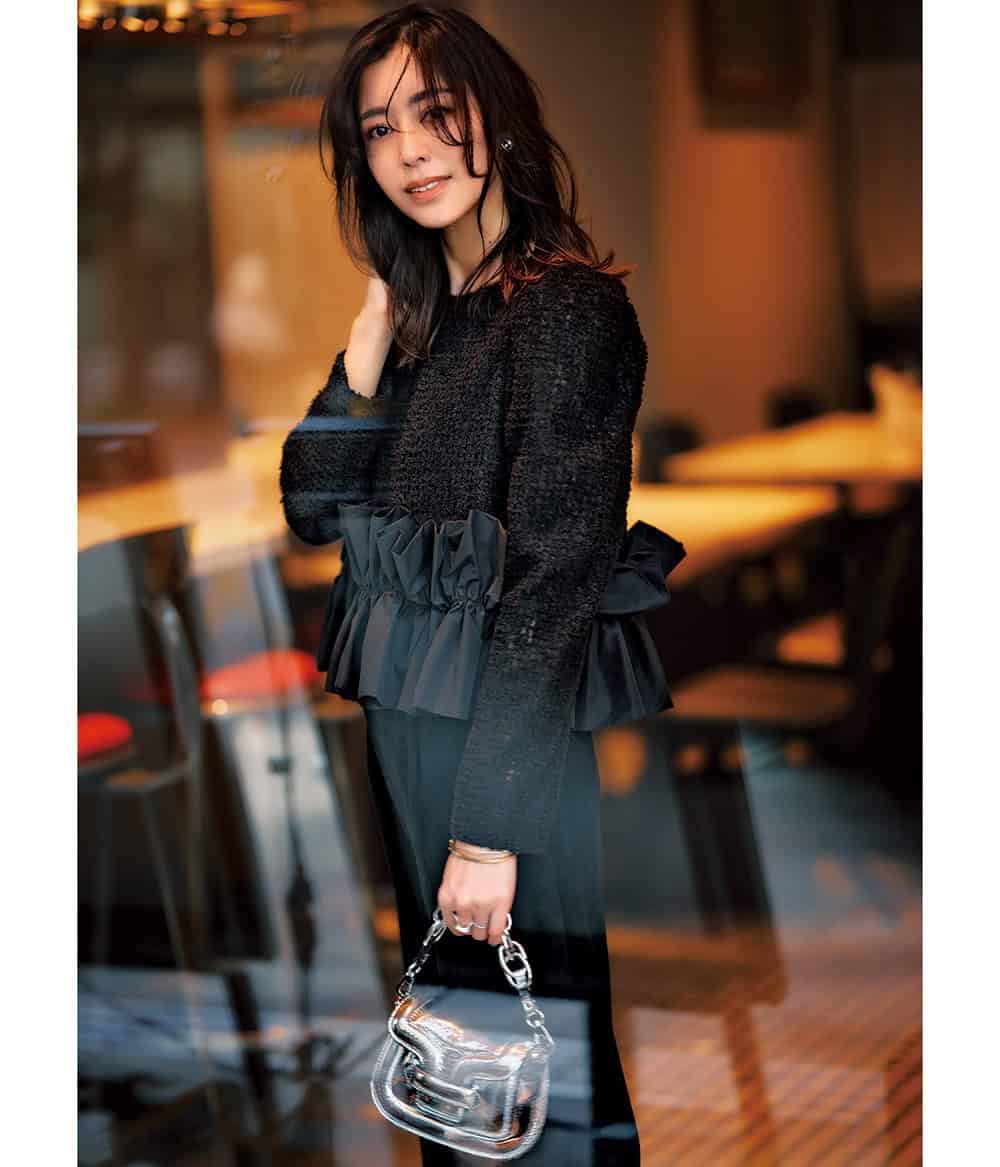 ツイード風素材×構築的なバルーンフォルムのフリルが華やか。定番ワイドパンツに1点投入するだけで、ドレスアップが叶う神トップス。