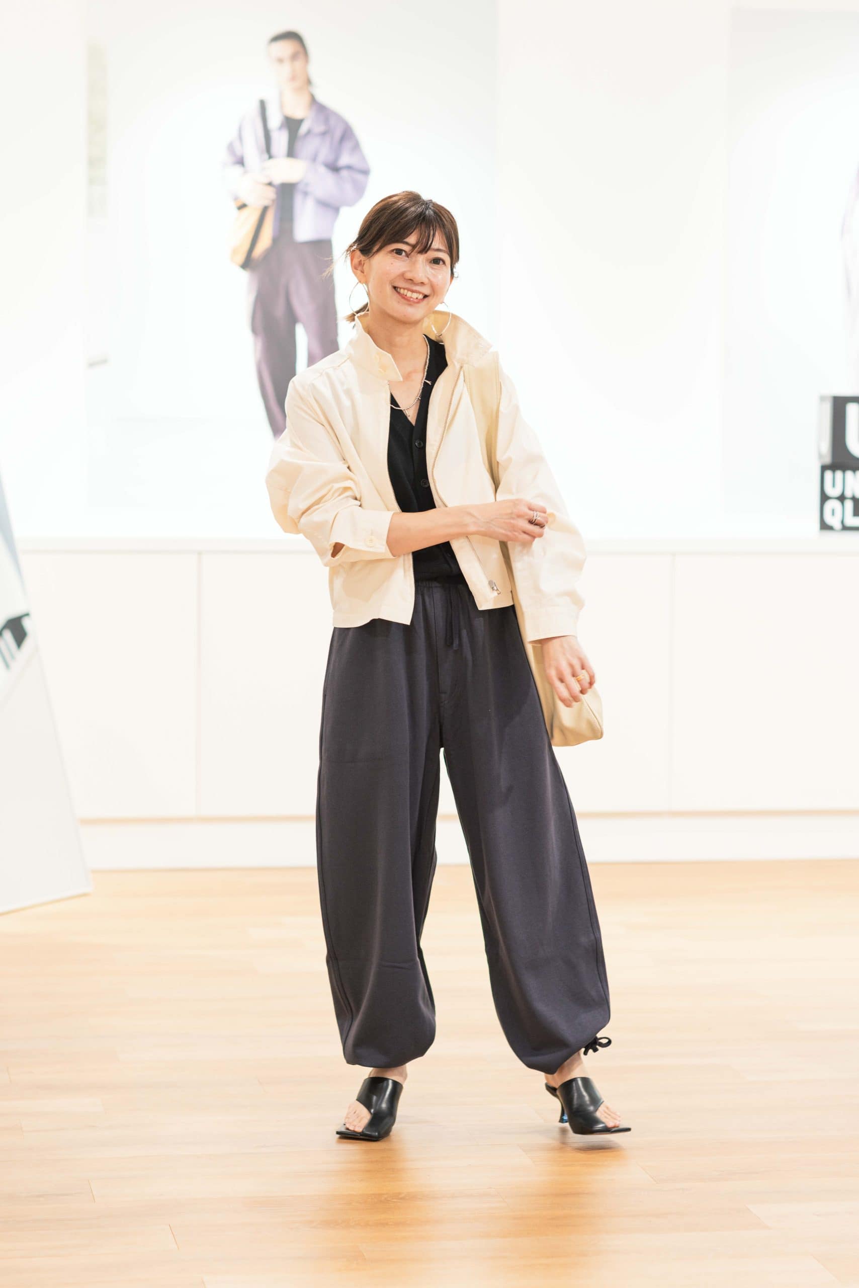 コットンブレンドショートブルゾン¥5,990 ウォッシャブルボタンダウンニットベスト¥2,990 スウェットカーブパンツ¥3,990(すべてユニクロ ユー/ユニクロ)※すべてMサイズを着用 バッグ、靴(ともに私物)