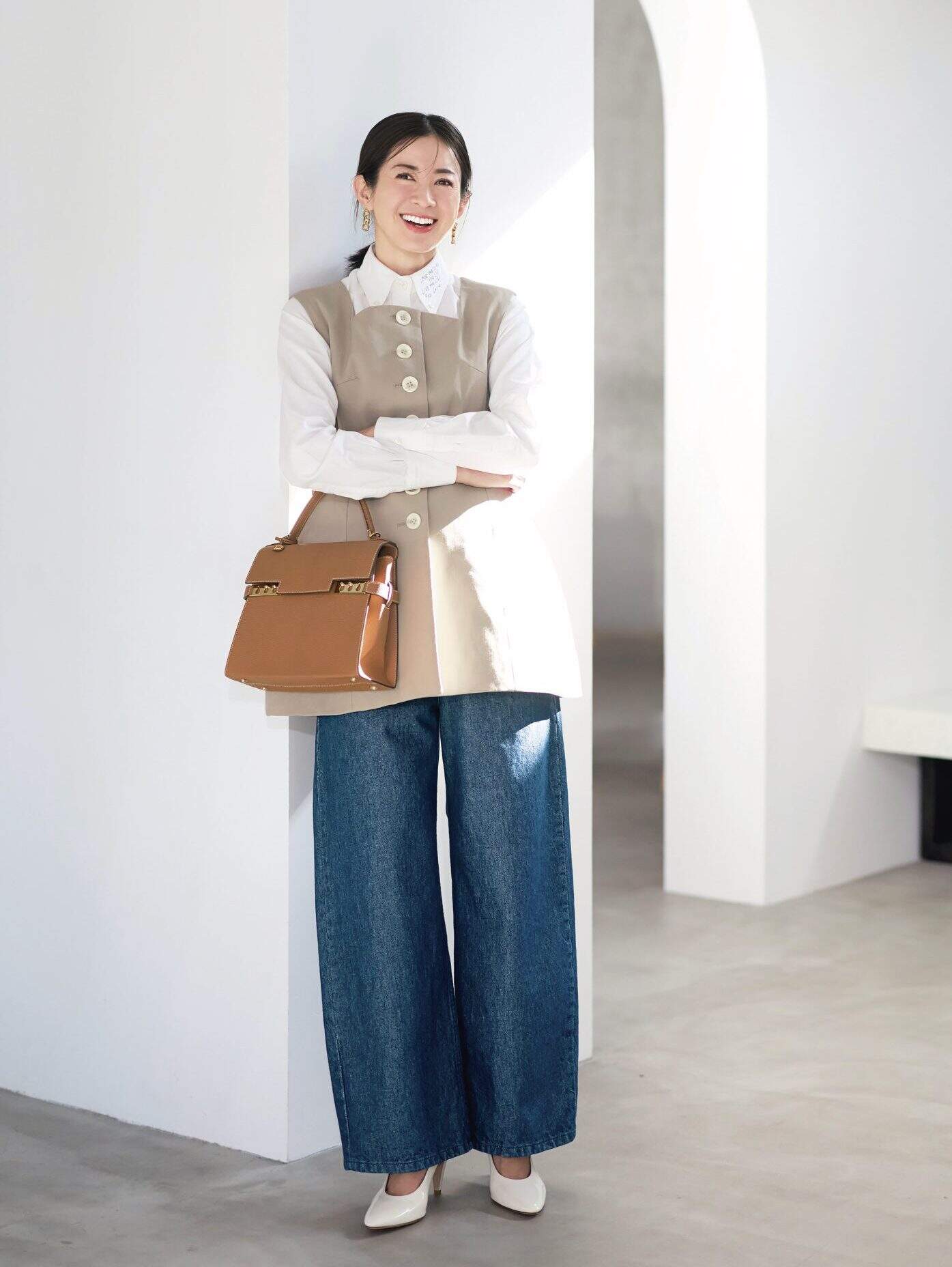 デニムパンツ¥22,000(サムシング/エドウイン・カスタマーサービス)ジレ¥129,800(マッキントッシュ/マッキントッシュ 六本木ヒルズ店)ブラウス¥28,600(セオリー/リンク・セオリー・ジャパン)バッグ¥209,000(J&M デヴィッドソン/J&M デヴィッドソン カスタマーセンター)バレエシューズ¥30,800(シーセイ/アイネックス)ピアス¥8,800(アビステ)バングル¥9,350(ココシュニック オンキッチュ/ココシュニック)