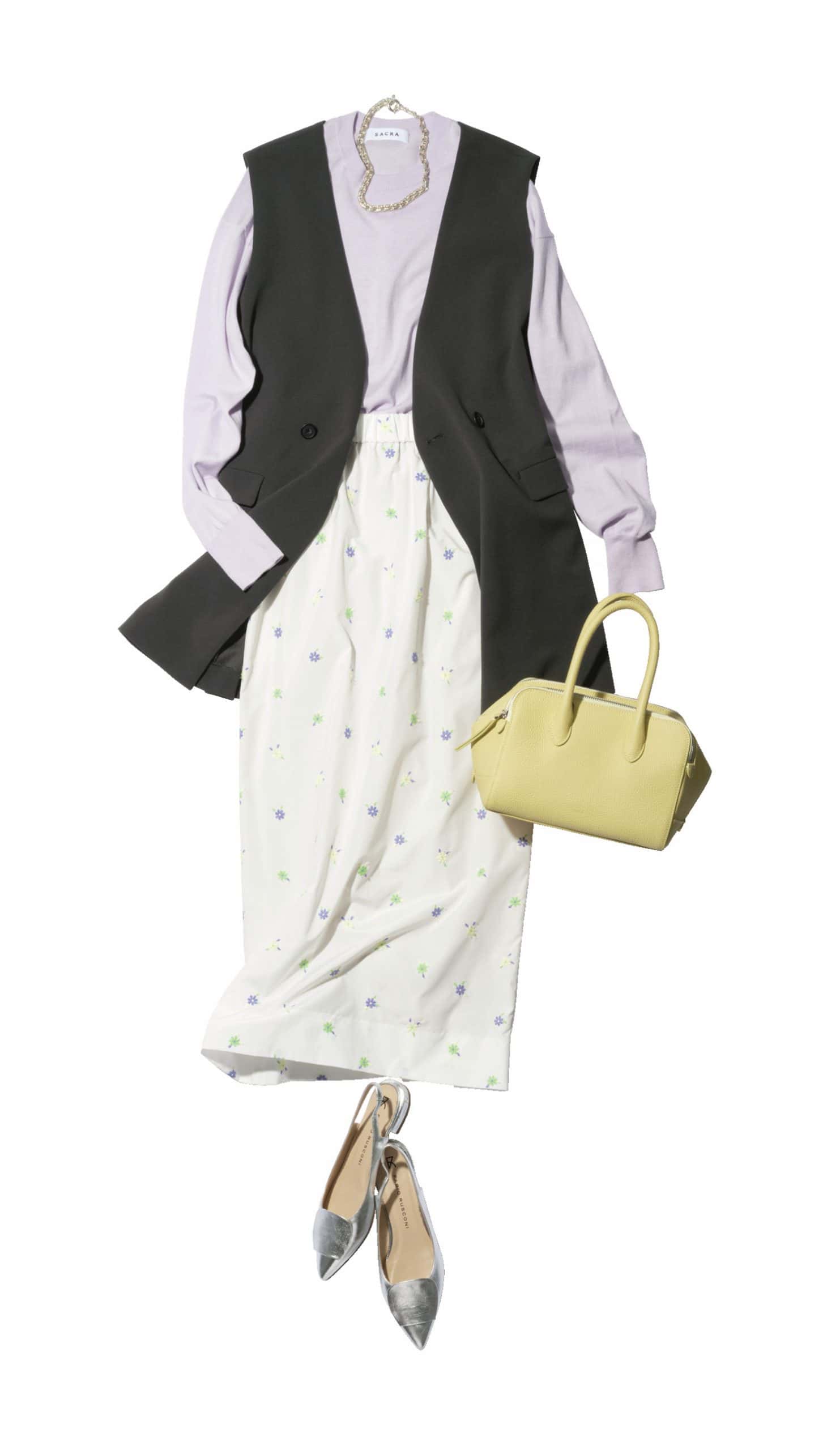 ジレ¥9,990(アンフィーロ)ニット¥29,700(サクラ/インターリブ)フラワー柄スカート¥33,000(yori)バッグ¥53,900(ヴァジック/ヴァジックジャパン)パンプス¥36,300(ファビオ ルスコーニ/伊勢丹新宿本店 本館2階 婦人靴)ネックレス¥22,000(アビステ)