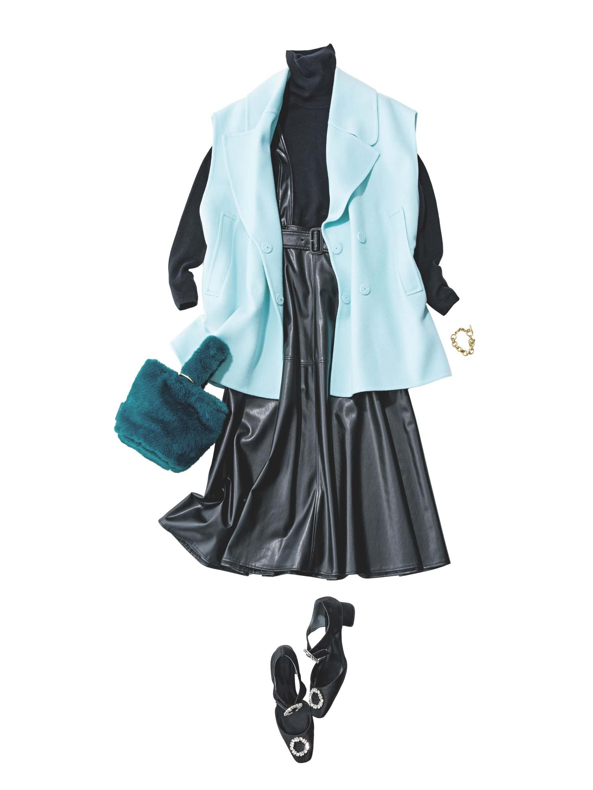 黒の上下に映える色味のジレを乗せることで、センターにほっそりしたIラインの出来上がり。存在感のあるビッグなカラー襟のおかげで、小顔効果までバッチリです。