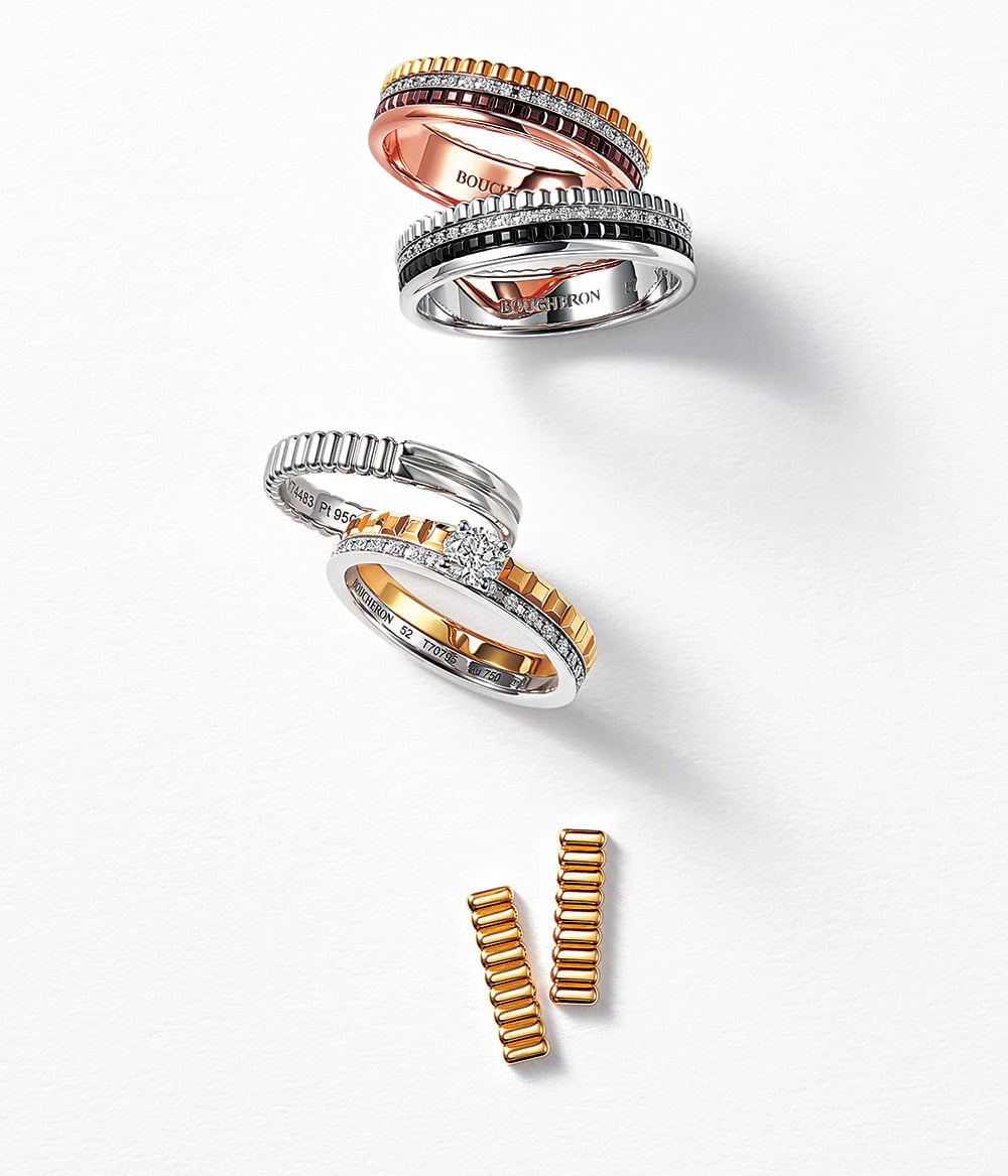 上から・リング「キャトル クラシック」〈YG×PG×WG×ブラウンPVD×DIA〉¥720,500「キャトル ブラック」〈WG×ブラックPVD×DIA〉¥775,500リング「キャトル ラディアント」〈Pt〉¥330,000リング「キャトル ラディアント」〈YG×WG×DIA〉¥84,7000〜1,600ピアス「キャトル グログラン」〈YG〉¥295,900※すべて予定価格(すべてブシュロン/ブシュロン クライアントサービス)