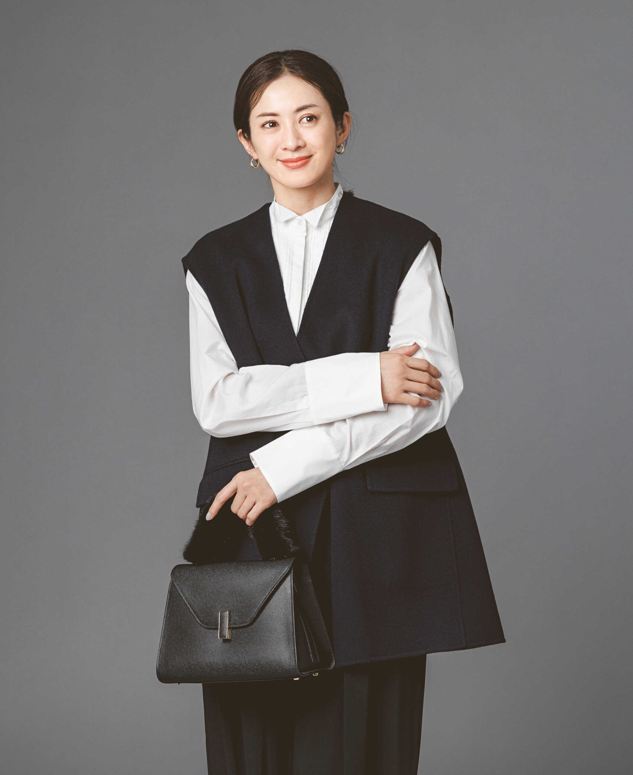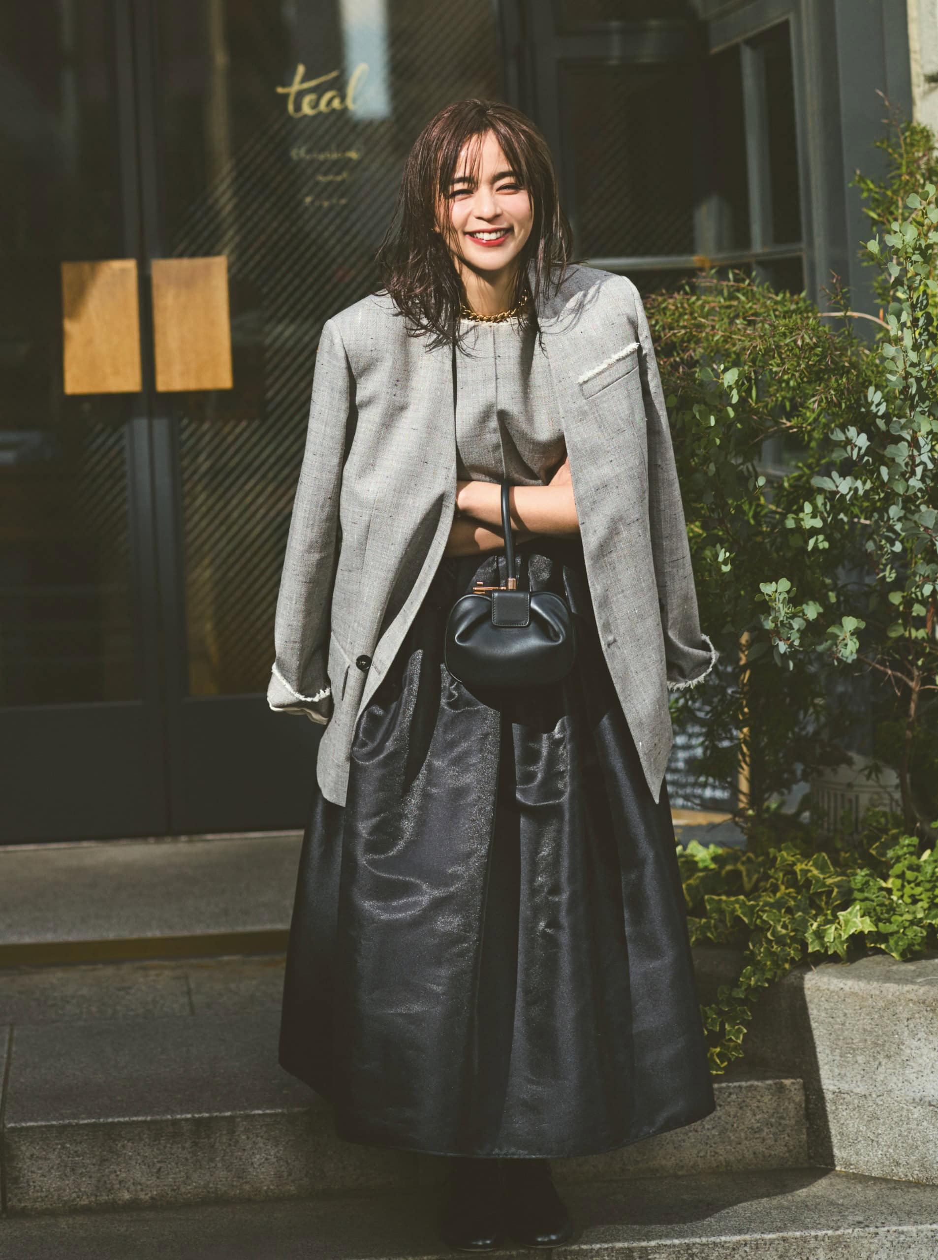 スカート¥30,800(HER.)ジャケット¥86,900トップス¥37,180(ともにTELA/ティースクエア プレスルーム)バッグ¥462,000(ガブリエラ ハースト/ガブリエラ ハースト ジャパン)パンプス¥110,000(ジェイエムウエストン/ジェイエムウエストン 青山店)ネックレス¥126,500(すべてビジュードエム/ビジュードエム六本木ヒルズ)タイツ/スタイリスト私物