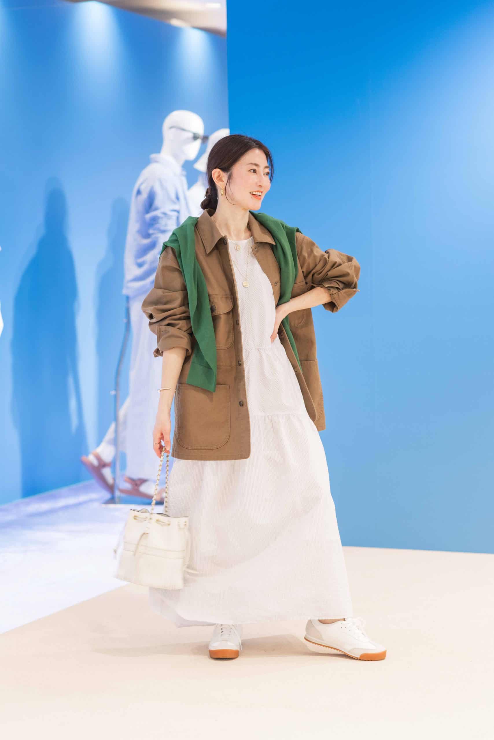 「凸凹感のあるシアーサッカー生地が清涼感たっぷりのロングワンピースは、ティアードデザインになっており、柔らかなボリュームが目を引く一着。そこに敢えてメンズライクなワーク感強めのオーバーサイズジャケットを合わせて辛さをON。足元はスニーカーを履いて甘辛コーデに。最後にグリーンのカーディガンを肩がけして差し色をプラス。春のお出かけにおすすめのコーデです」