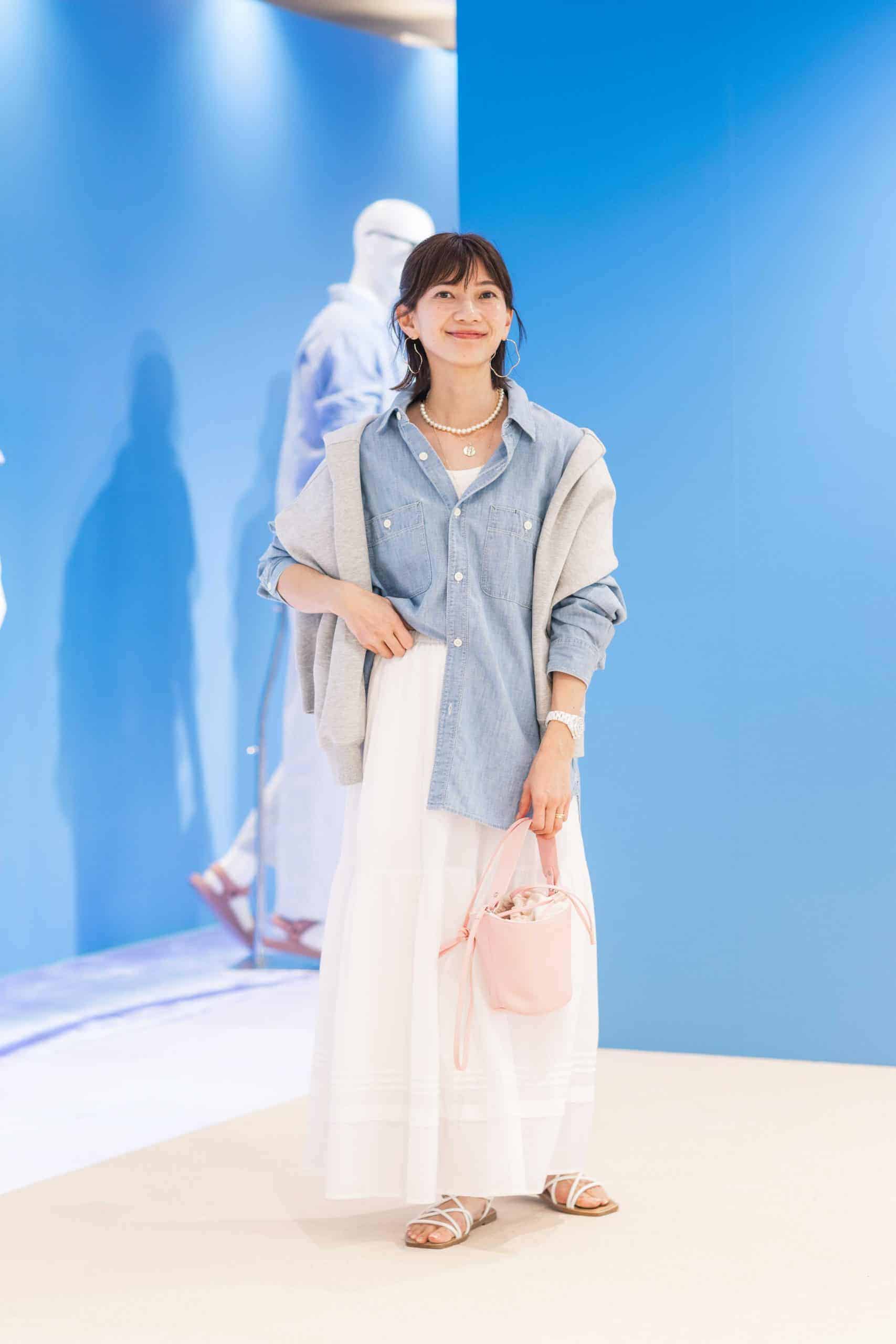 「真っ白なスカートは涼しげで春夏に重宝するアイテム。デニムシャツでラフに崩しつつ、パーカーを肩がけしてコーデに立体感を出すことで計算された大人カジュアルに。逆に足元はストラップサンダルで素肌を見せて、軽やかさを出してバランスをとりました。抜け感とメリハリどちらも意識した春コーデです」