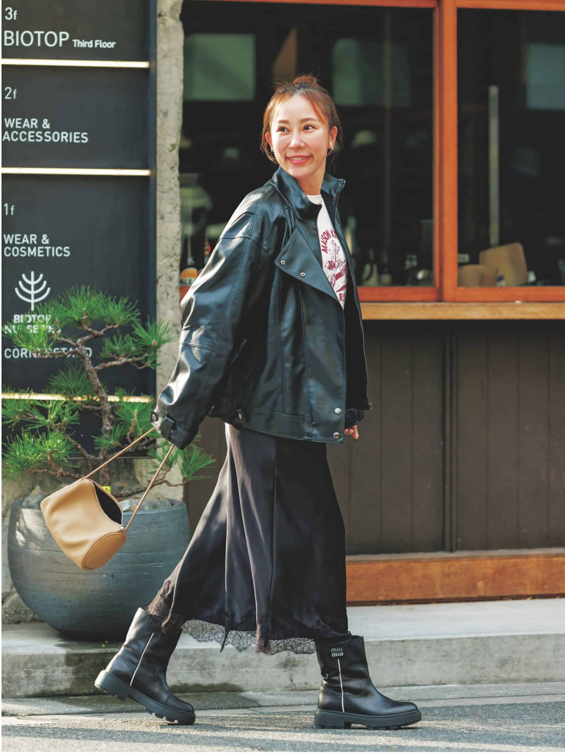 落ち着いたブラウンのスカートが女の色気を放出。モードな黒コーデに溶け込みつつ、ほんのり柔らかさを高めてくれます。サラッとしたとろみ素材も春らしい軽やかな着こなしにピッタリです。