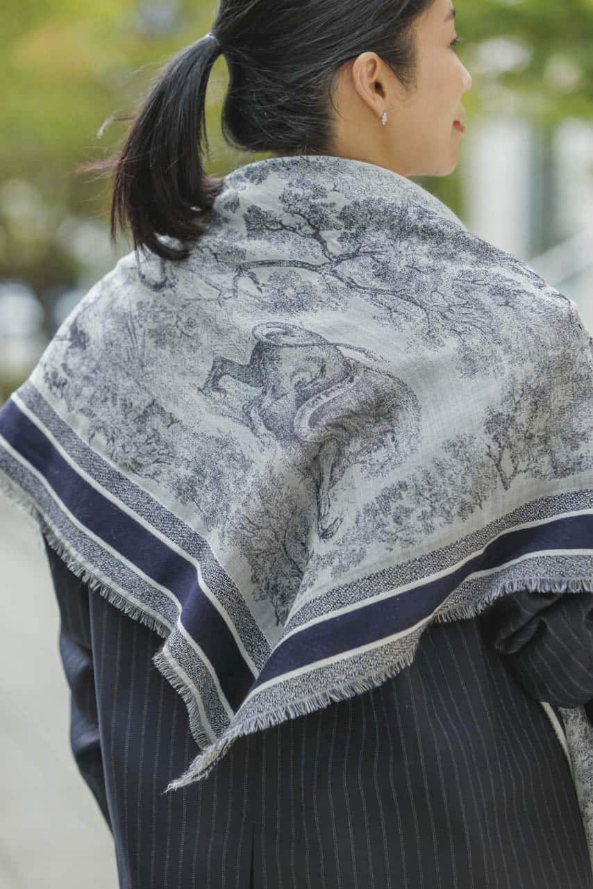 ストールは2025年の春に買ったもの。色合いや柄が合わせやすく、デニム合わせをしたいと思い購入。マダムになりすぎないよう、きちんと感の中にもカジュアルに落とし込んでリラックスした雰囲気を意識しました。春夏はワンピースの上にサラッと巻いて日焼けや冷房対策にも活躍してくれそう。