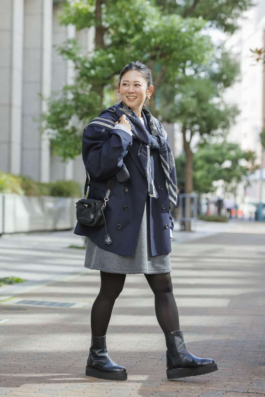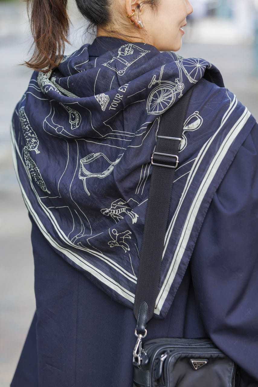 ストールは去年の夏頃に買ったもので、パリの名所のイラストや、大判でふんわり柔らかい素材感がお気に入り。シーズンレスで使えるのも高ポイントです。カジュアルなグレーのミニワンピは若作りに見えないようネイビージャケット合わせで回避しつつ、ストールでこなれ感をプラスします。