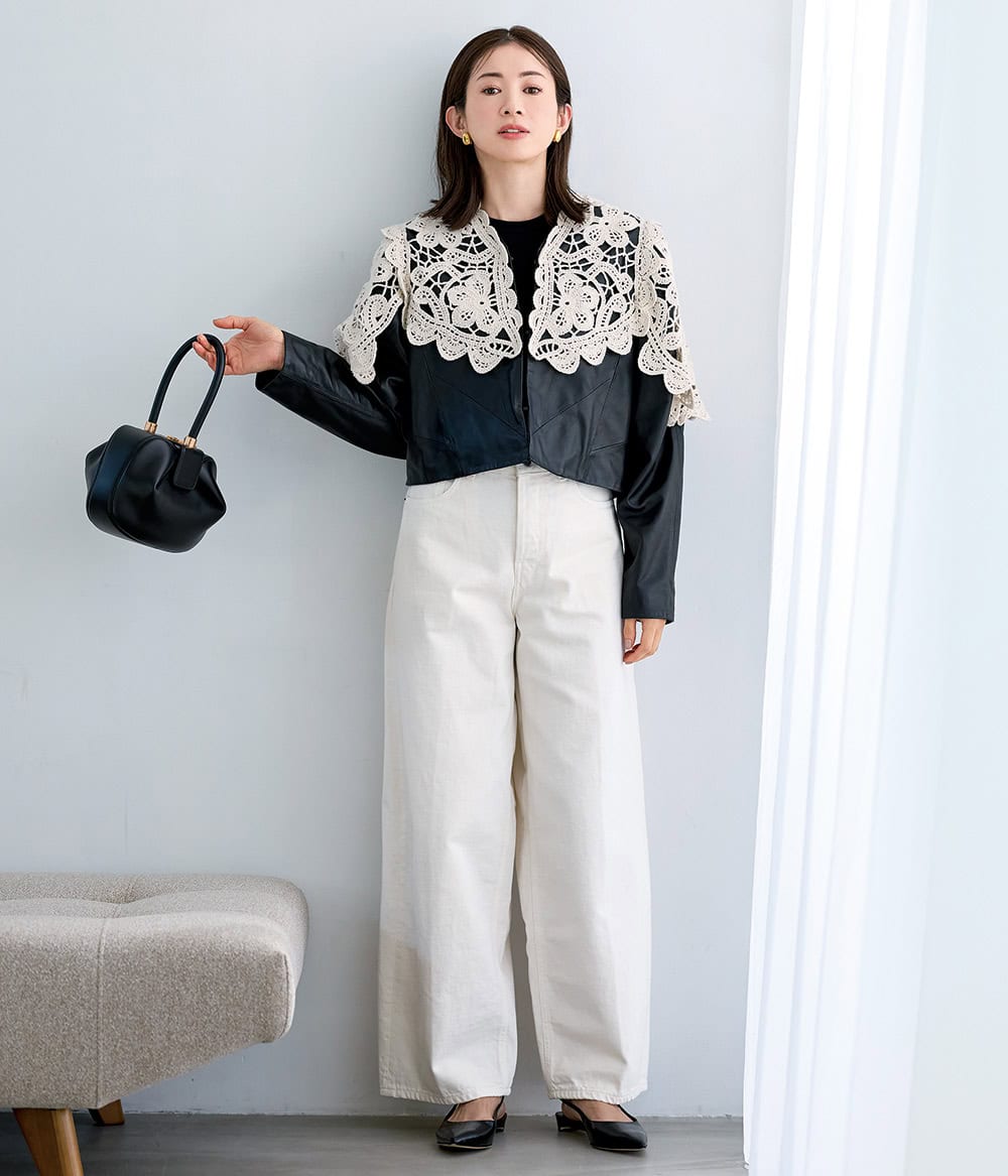 丸みのある白バレルが黒レザーのハードさを中和。体型を拾わず、旬のレース使いで甘ニッシュも即完成。オシャレに気が抜けない女友達との集まりにもピッタリ!