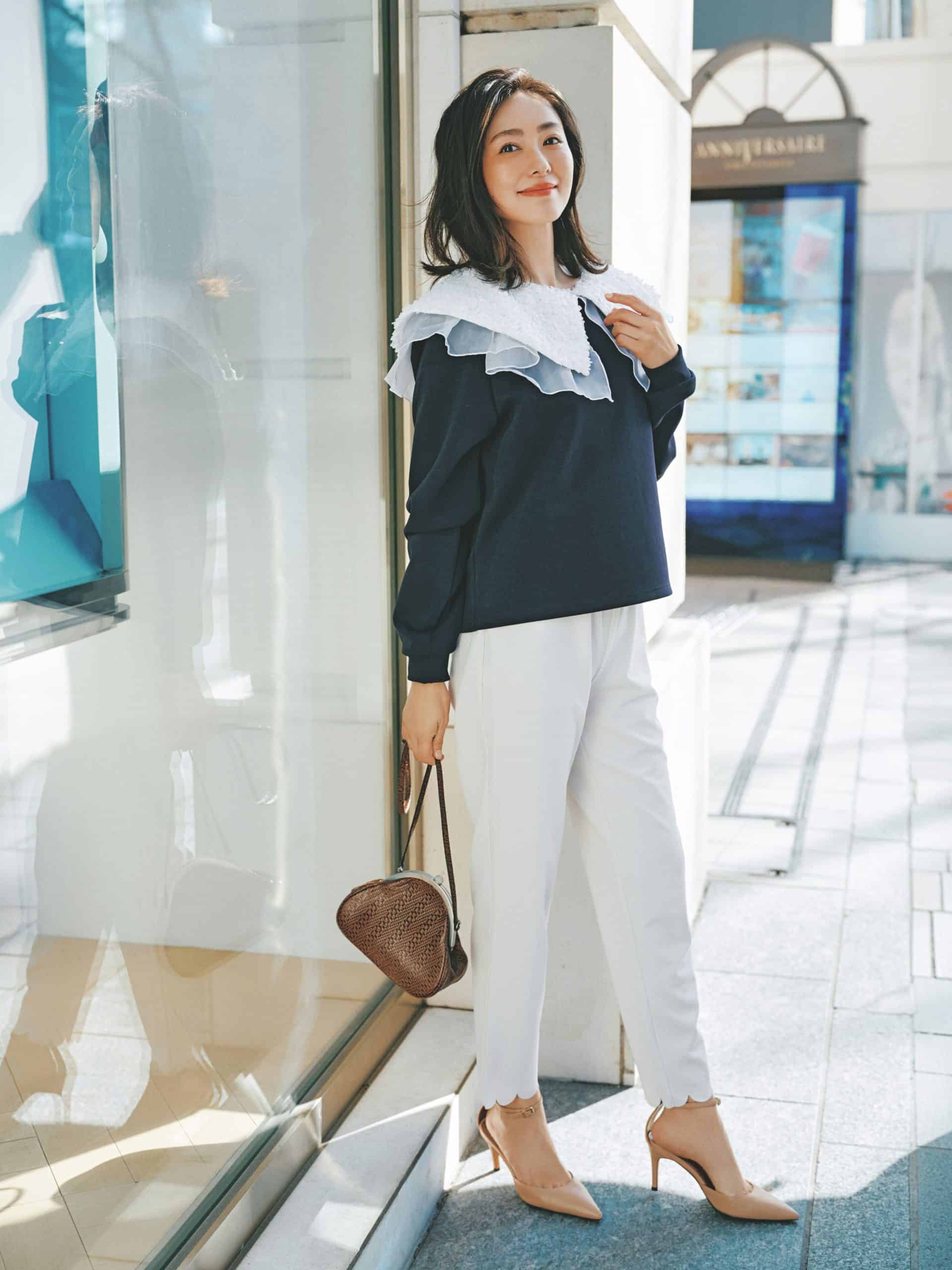 トップス¥15,400(アレア)パンツ¥4,990(ユニクロ)バッグ¥16,500(ダイアナ/ダイアナ 銀座本店)パンプス¥53,900(コルコバード/フィルム)