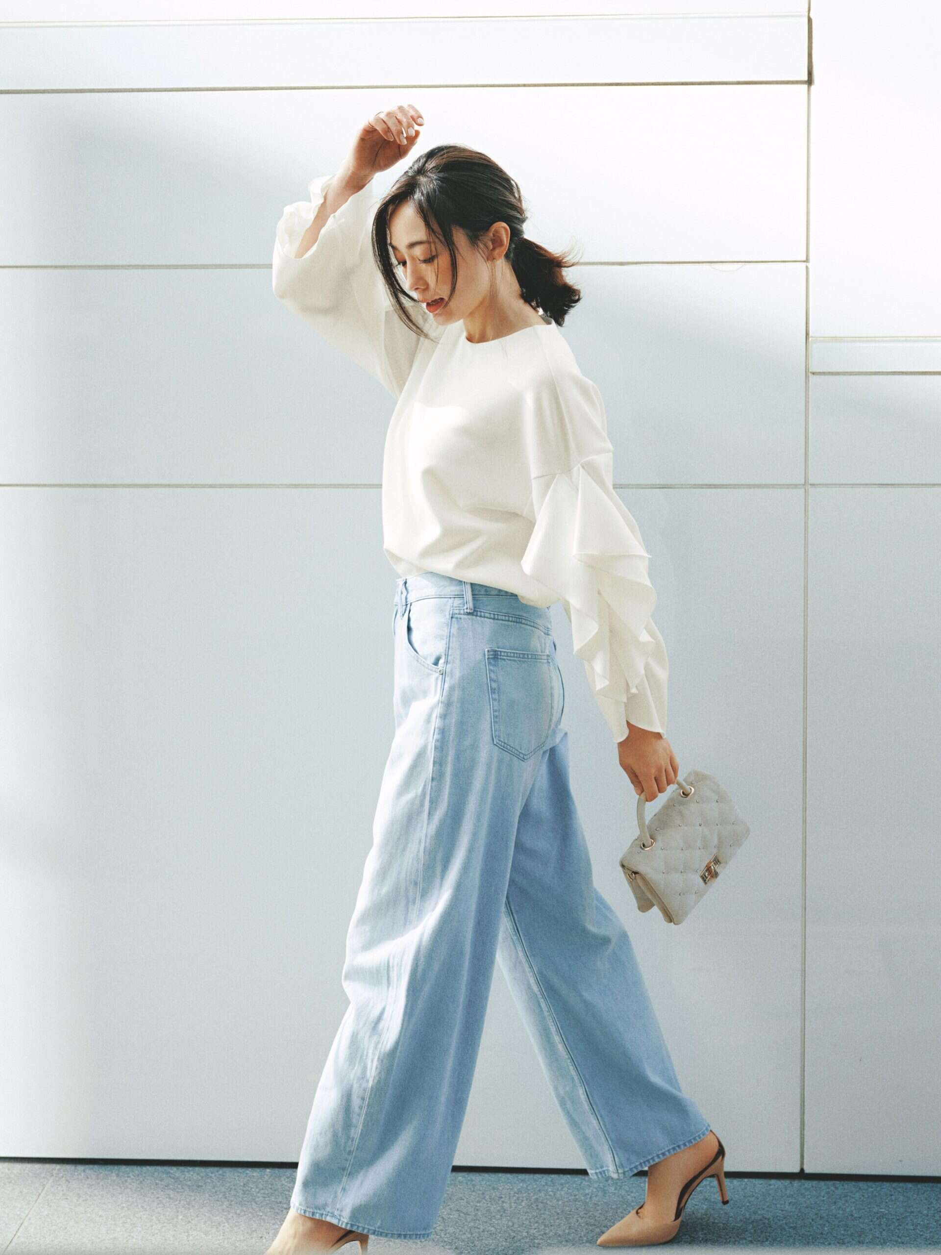 袖を覆うアシンメトリーなフリルが絶妙にキュート。動きのあるディテールのおかげで、お出かけが自然と楽しくなりそう。軽快なライトブルーのジーンズが春トップスの匙加減におすすめです。