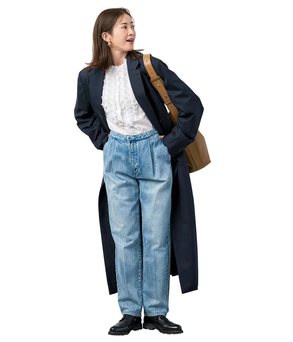 ボタンを削ぎ落としたキレイめに穿ける1本。顔まわりを盛ってお腹周りは楽チンが快適! 甘ブラウス×ロングコートで品よく。ブルーのタック入りデニムは、デスクワーク中心の日もお腹周りがゆったりして、きちんと見えと快適さを両立。
