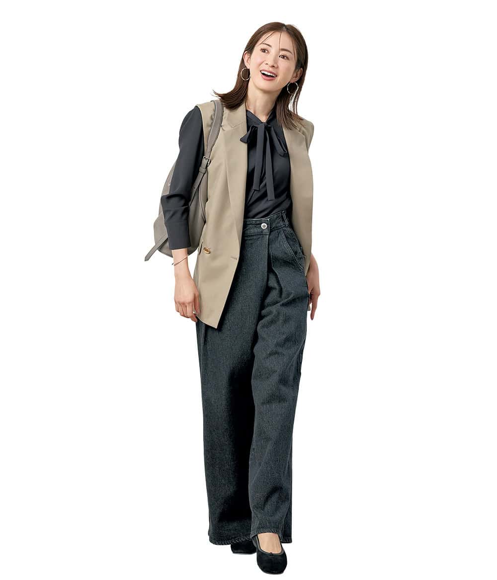 お腹周りをカモフラする新顔ラップ風デニム。いつもの通勤コーデを変化球デニムで鮮度UP! 黒のボウタイブラウスに旬のラップ風タックデニムを合わせてお仕事コーデを更新。ベージュのジレで柔らかさを足し、トレンド感も機動力も欲張れる。