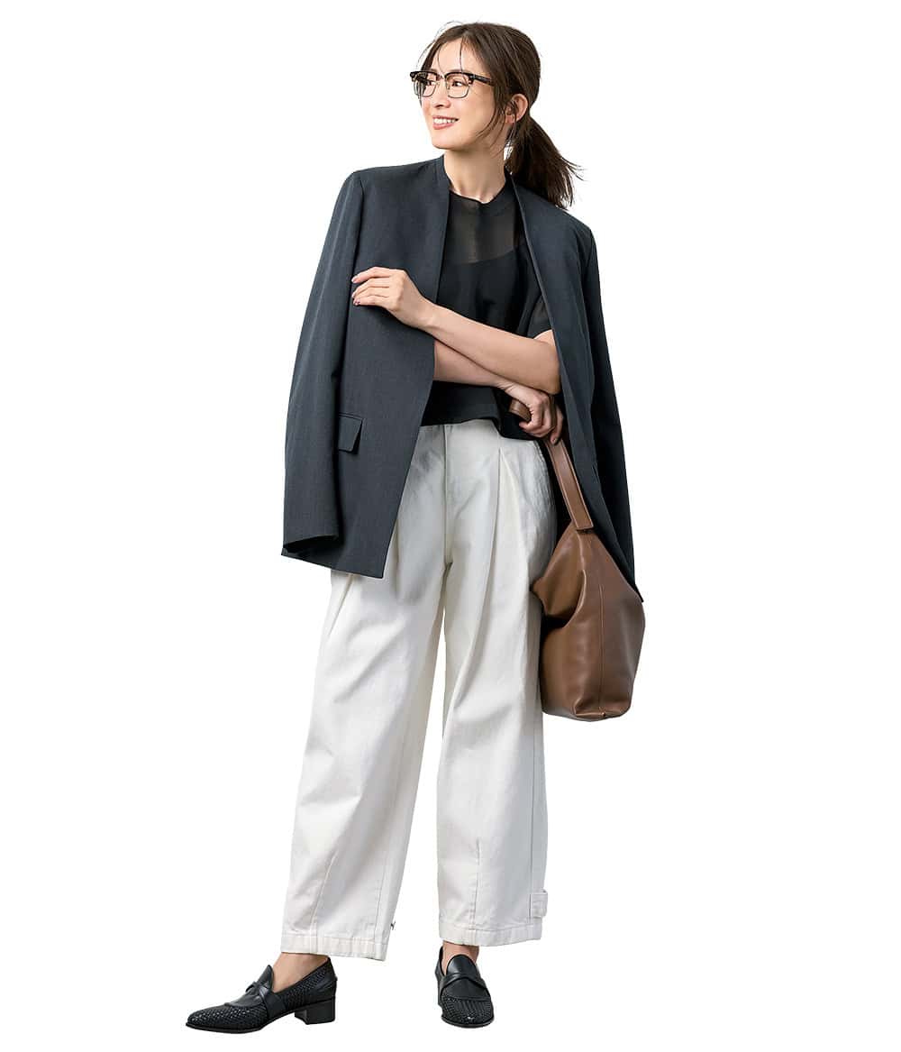 お尻回りはゆったりウエストゴムの気軽さ。フッ軽オシャレで出来る私を後押し! 白のタックデニムに直線的なノーカラージャケットを重ねて仕事仕様に。無駄のない配色で軽やかに動けて、タイパも良く仕事の業務効率まで底上げ。シアーインナーでデニム感を払拭。