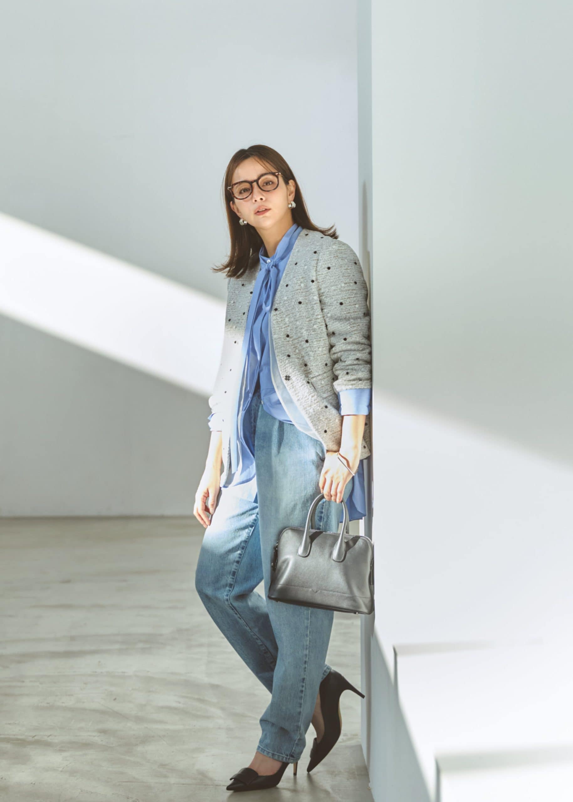 ジャケット¥49,500(ボールジィ/トゥモローランド)ブラウス¥58,300(エブール/リトルリーグ インク)デニムパンツ¥39,600(サードマガジン)バッグ¥561,000(ヴァレクストラ/ヴァレクストラ ジャパン)パンプス¥130,900(セルジオ ロッシ/セルジオ ロッシ ジャパン カスタマーサービス)ピアス¥66,000バングル¥79,200(ともにブランイリス/ブランイリス トーキョー)メガネ/スタイリスト私物