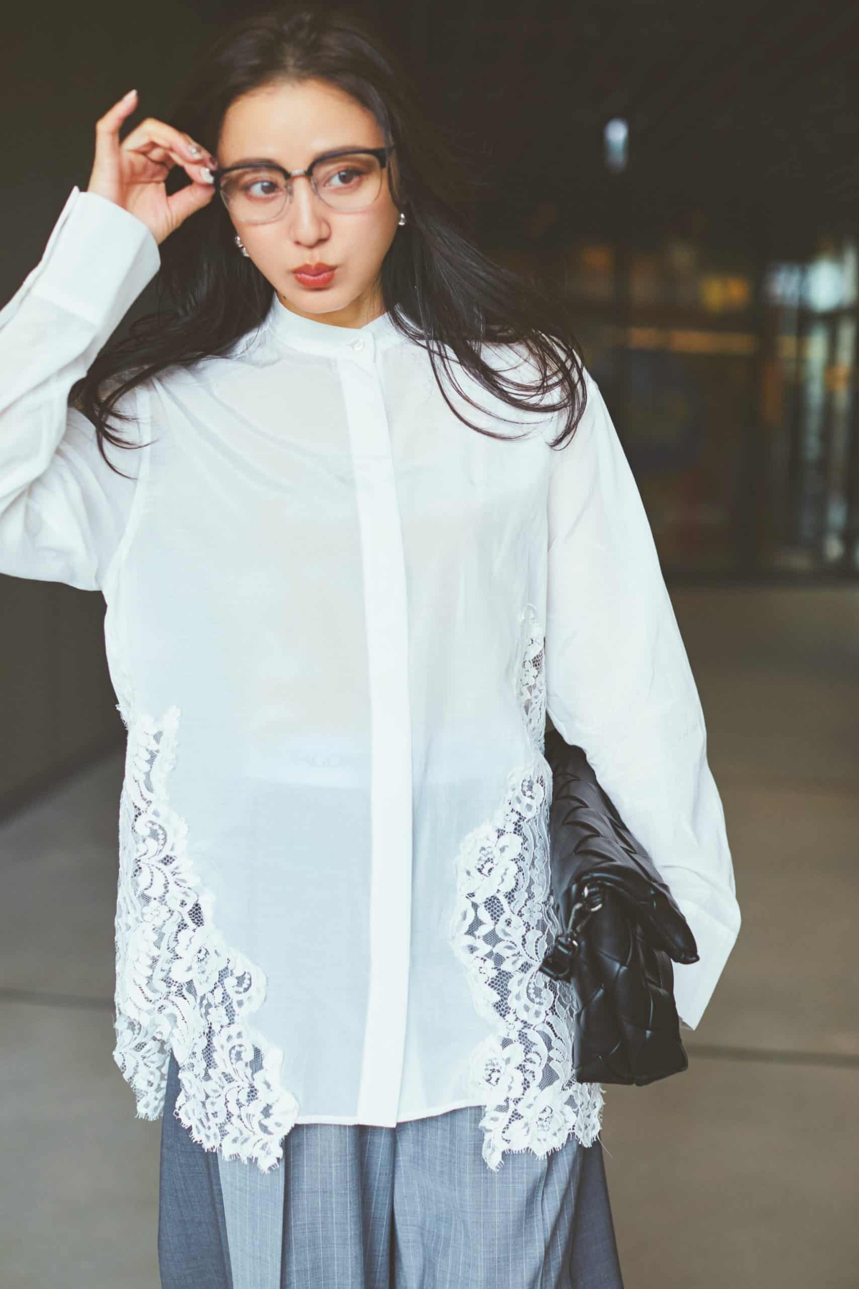 レースブラウス¥48,400(ベイジ,/オンワード樫山 お客様相談室)パンツ¥37,400(プロタゴニスタ/アマン)バッグ¥28,600(ヴィスク/エスアンドティ)メガネ¥27,280(レイバン/ルックスオティカジャパン カスタマーサービス)ピアス¥38,500(プラウ)