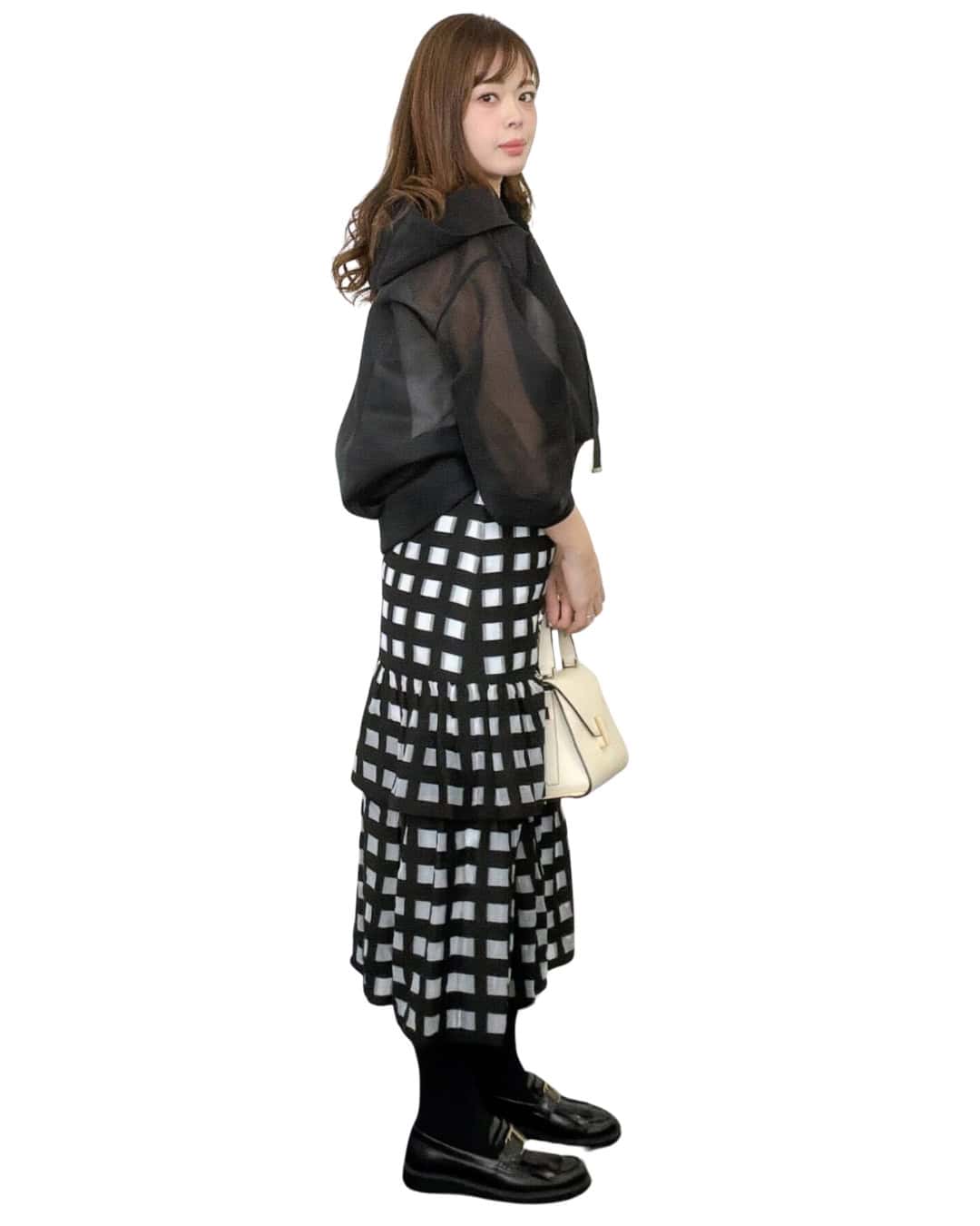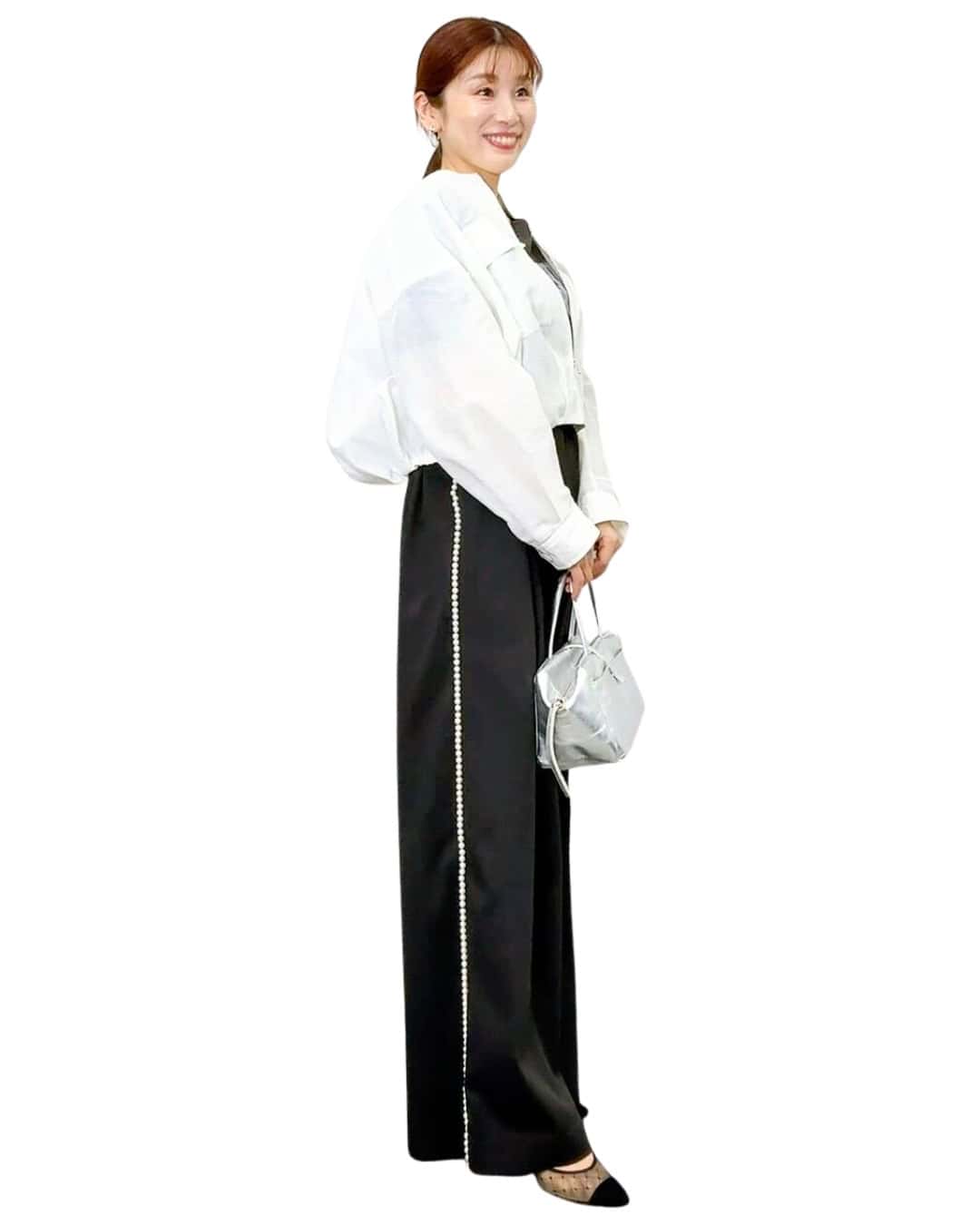 ②1枚あると助かる!シンプルながら華やかな印象になる「シアートップス」