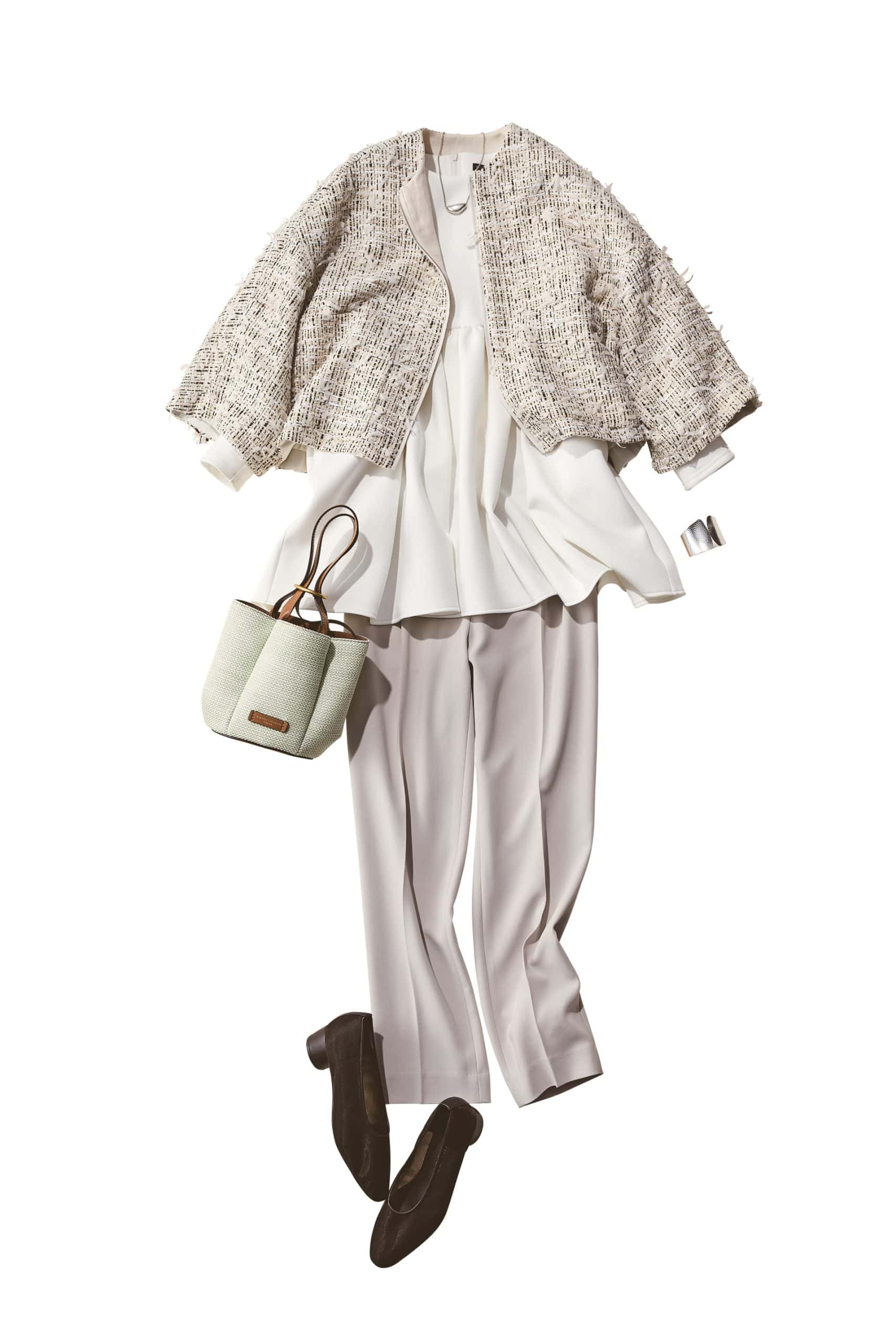 高めの切り替えから広がるフレアシルエットで、お腹をふわっとカバー。短丈ジャケットで重心を上げることで全身をすっきり見せます。きちんと感と体型カバーを両得できるスタイル。