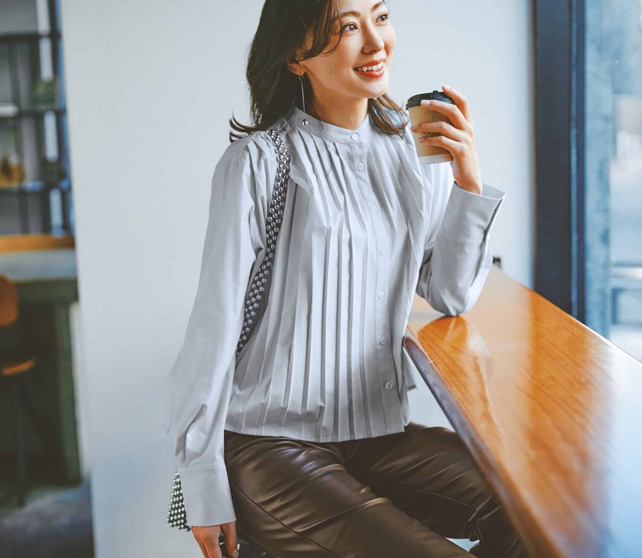 ふわっと隠す=ふわふわ素材のみならず!今年のトレンドでもあるプリーツデザインは、スマートな印象をもったままカバーできる優れもの!縦ラインを強調しつつ、体の凹凸を拾わずすっきり見え。アウトに丁度いい丈感でお腹まわりをカバーしながら、レザーパンツが程よく引き締めます。