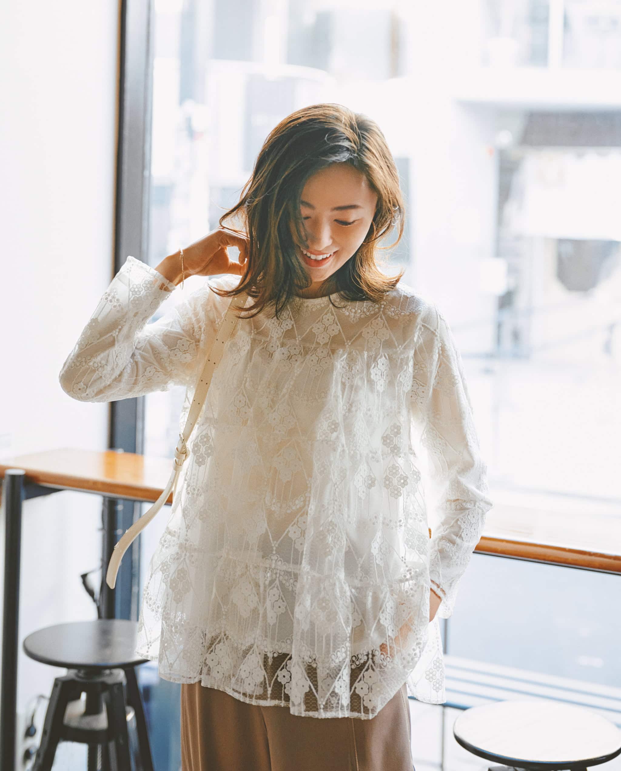 レースブラウス¥48,400(ベイジ,/オンワード樫山 お客様相談室)パンツ¥37,400(プロタゴニスタ/アマン)バッグ¥28,600(ヴィスク/エスアンドティ)メガネ¥27,280(レイバン/ルックスオティカジャパン カスタマーサービス)ピアス¥38,500(プラウ)