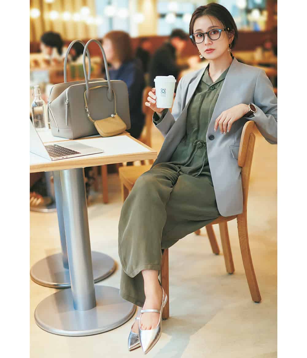 グレージャケット¥23,100(ノーク)ジャンプスーツ¥42,900(RHC/RHC ロンハーマン)バッグ¥63,800(ヴァジック/ヴァジック ジャパン)シューズ¥36,300(ファビオ ルスコーニ/伊勢丹新宿本店 本館2階 婦人靴)メガネ¥23,800(カリン/STARDREAM JAPAN)ピアス¥8,800(スティーン/フラッパーズ)時計¥22,000(ete)