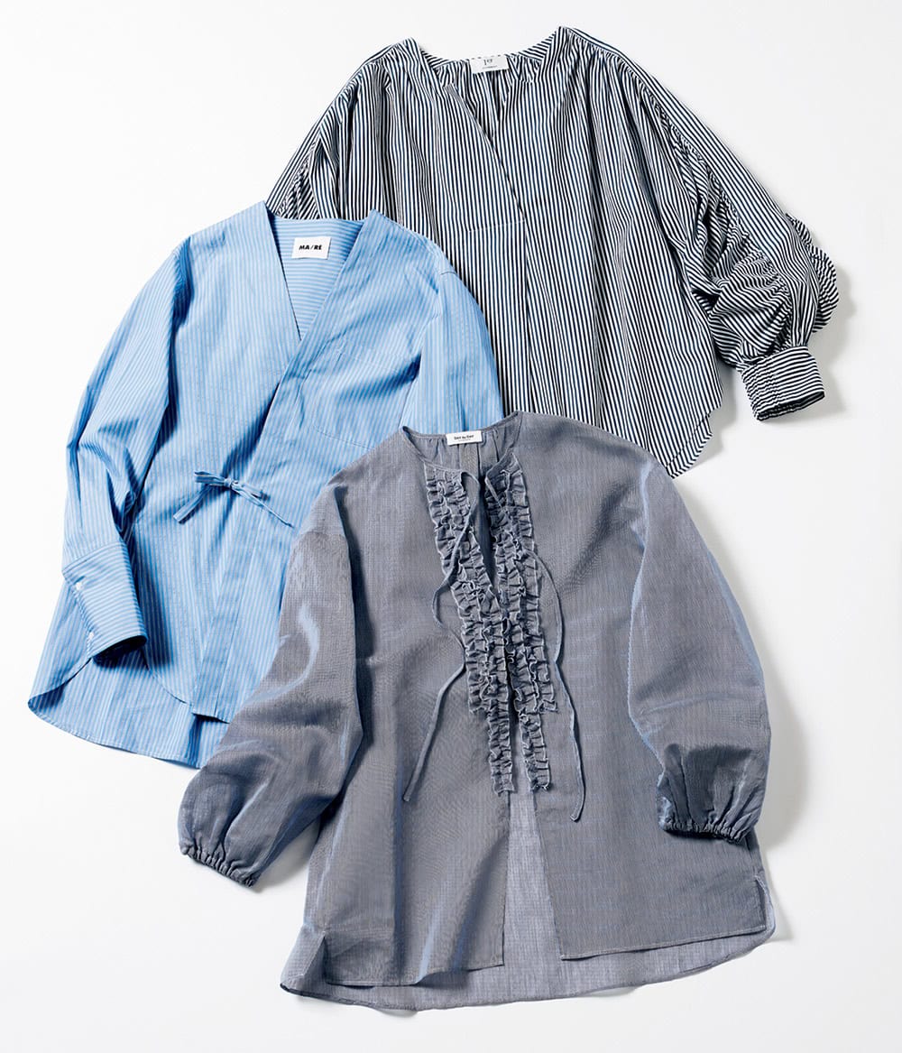 <上>着ストライプブラウス¥29,700(プルミエ アロンディスモン)<中>カシュクールシャツ¥42,900(マレ/ユナイテッドアローズ 渋谷スクランブルスクエア店)<下>フリルブラウス¥16,940(Day by Day It’s international)